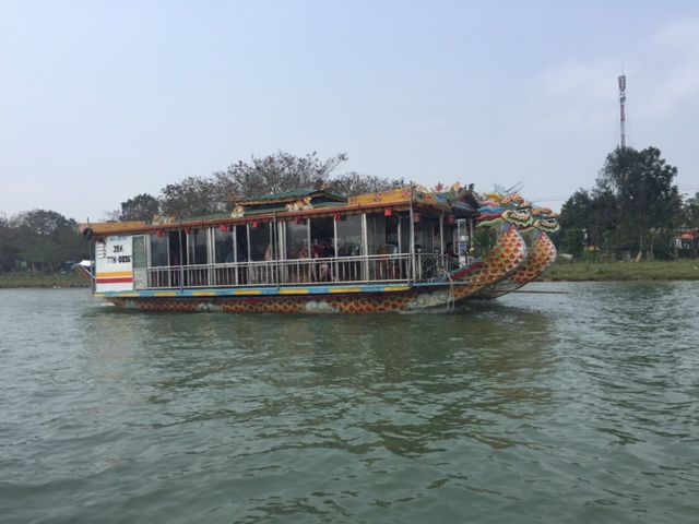 小雨で寒かったですが予定通りの迎えでフエへ。道路は山道でしたがハロン湾の時のような凸凹道じゃなかったので車酔いは無し(ホッ)。トイレ休憩で立ち寄った食堂でビックリ、トイレに便器が無い!!昔は日本もこうだった?カイディン帝廟ではビール瓶や陶器などの装飾が面白かった。ドラゴンボート、ランチはフエの宮廷料理、フエ王宮はまだ修復?されてなくてパネル展示が多かったですが、戦争の悲惨さが感じられます。ガイドさんが気をきかせてドンパ市場のあとにフェヴァのチョコレートショップ近くまで連れて行ってくれて(日本の女子に人気)ハノイで買えなかったので嬉しかった。今回はプライベートのようなツアーだったので、私達の意を組んでいただけ大満足の一日でした!