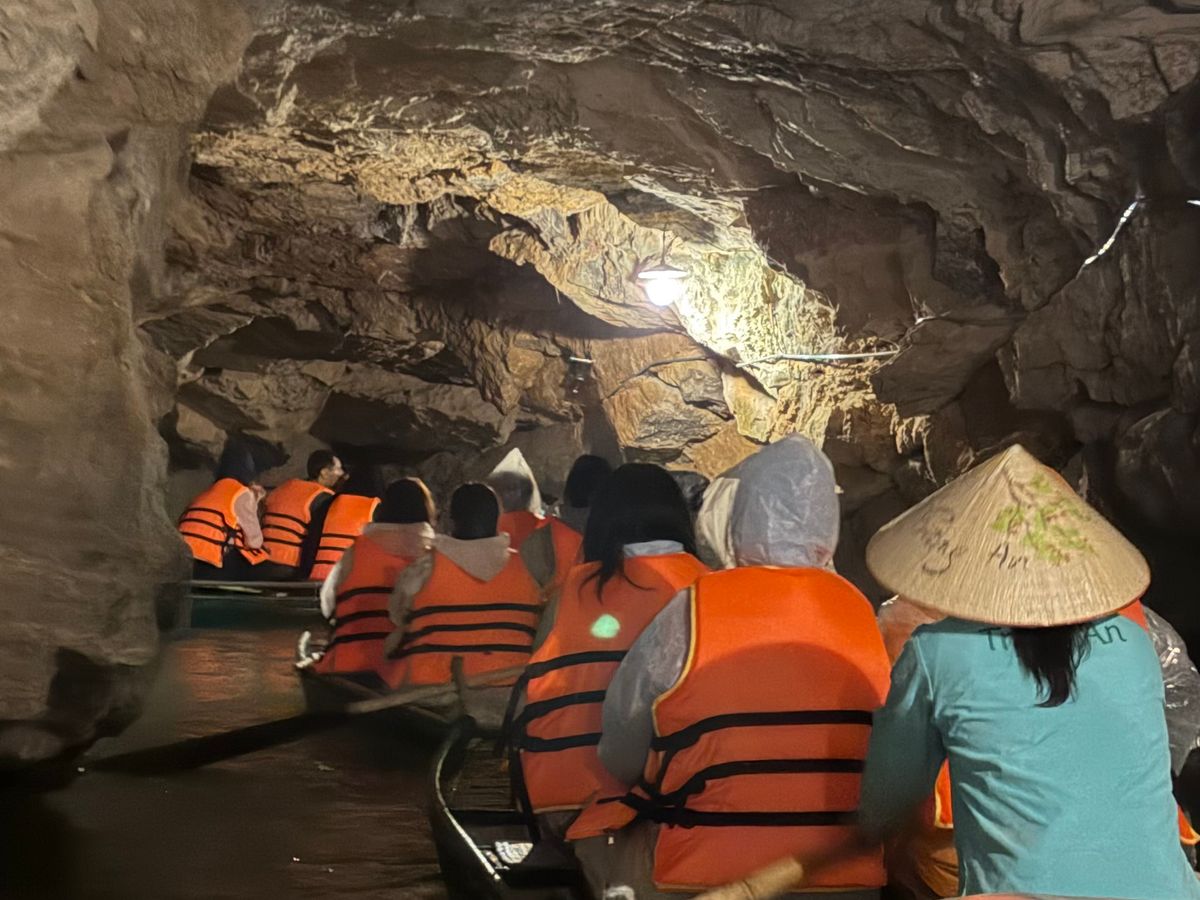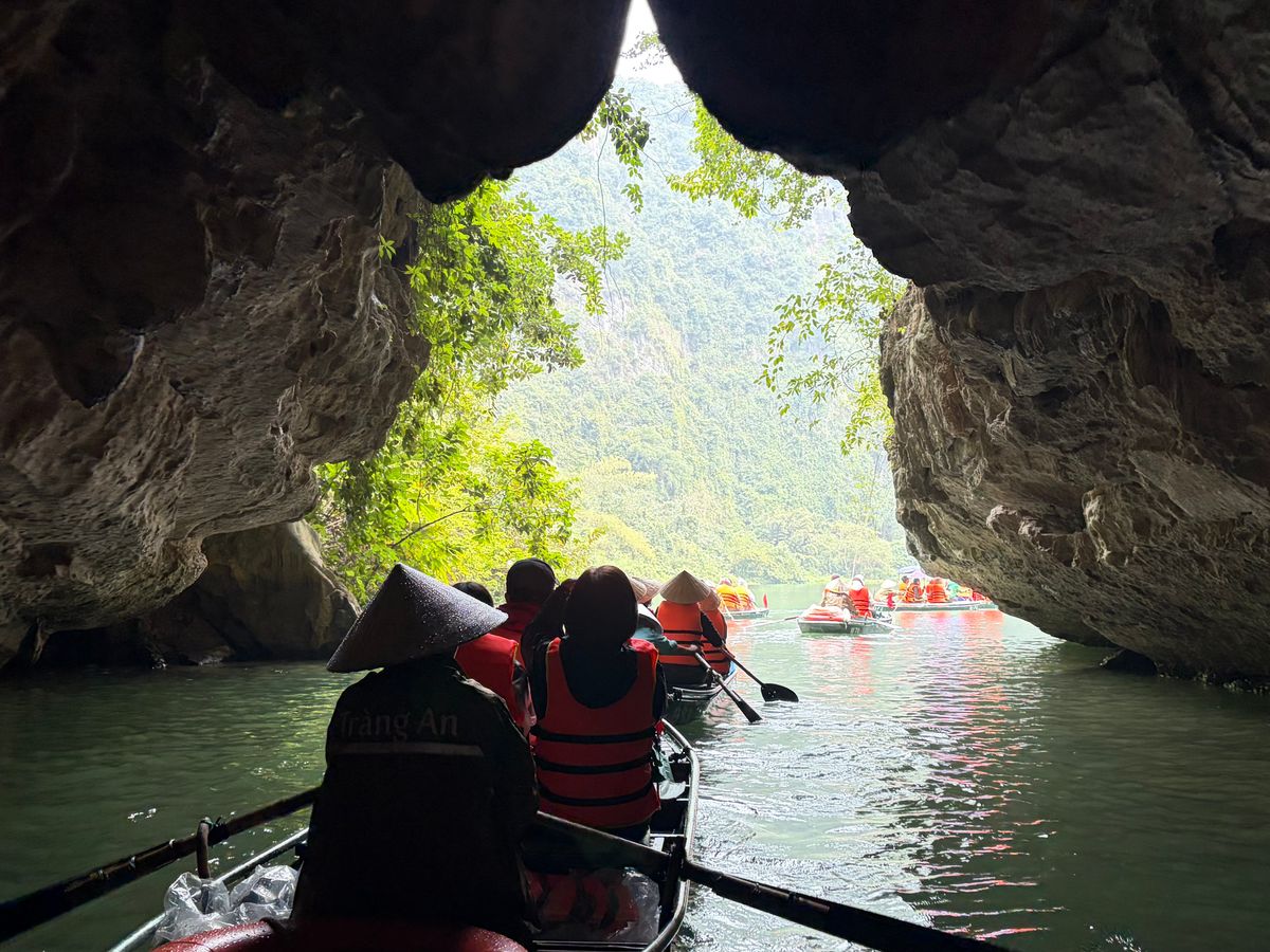 ベトナム料理の昼食をはさみ、午後は約2時間かけて「ベトナム陸の桂林」といわれているチャンアン渓谷の手漕ぎ船に乗り、地元の船乗りガイドさんの説明を受けながらいくつかの鍾乳洞を通りゆっくりと絶景を楽しむことができた。