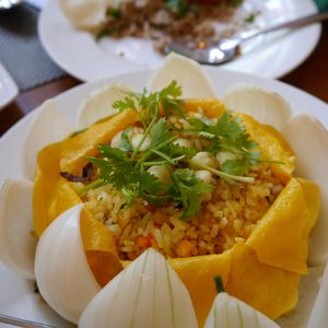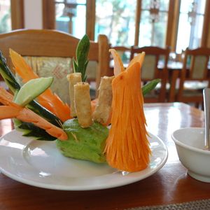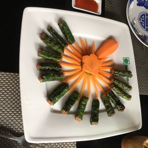 ニンジンやキュウリの飾り付けがかわいい感じで、宮廷料理と言っても、厳かな雰囲気はありませんでした。料理の中身は、揚げ春巻きや、炒め物、チャ─ハンなどで、味は美味しかったです。
