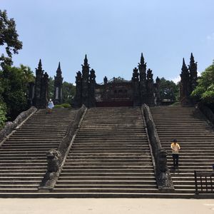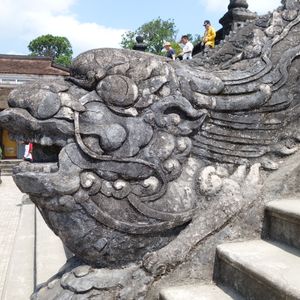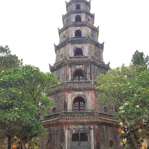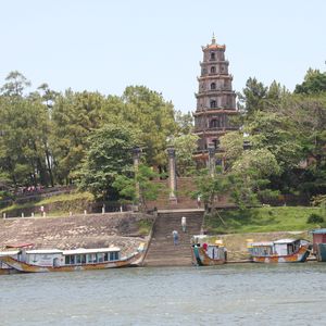 観光の順序は予定表と違い、①フエ王宮②ドラゴンボート③天母寺④昼食(Hoa Vienさん)⑤カイディン帝廟の順でした。フエの王では少し自由時間があるので、あらかじめ見る所を決めておいた方が効率が良いと思います。それから、ドラゴンボートに乗って天母寺の前の船着き場に到着します。その前に、フォーン川から塔と階段が一直線になるタイミングがあるので、船首に出て撮影してください。ダナンからフエはタクシーをチャーターして行けないことはありませんが、効率よく観光ができるのでツアー参加をお勧めします。