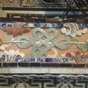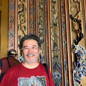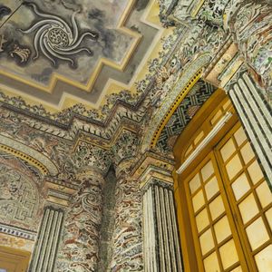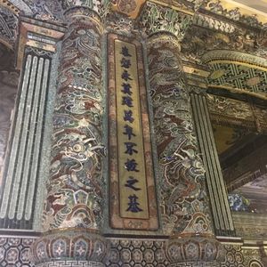 最初はカイディン帝廟に行きました。陶器やガラスで細工がされた柱や一面の壁には圧倒されました。その中には日本のビール瓶のガラスも使われていましたよ。一見の価値あり!!
