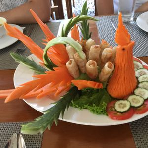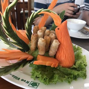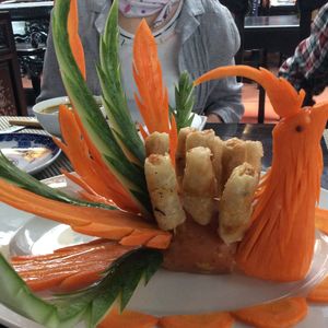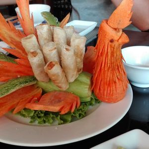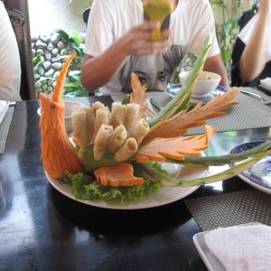 ランチのベトナム料理は、フエの宮廷料理とのことで、おいしいのはもちろんのこと、見た目がどれも可愛く目を引くものばかりで、次に出てくる料理が楽しみでした。ツアーの他の参加者たちとも、写真を撮るなどして楽しみながら食べることができました。写真は揚げ春巻きです。
