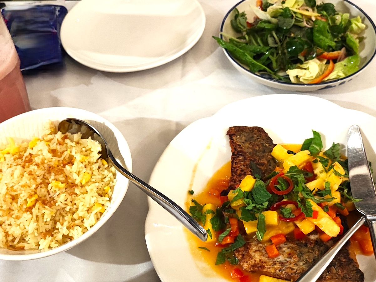 下船後、レストランプロパガンダへ。ガイドブックにもよく載っていますが、お店はカラフルでわくわく。メニューは前菜3種とメインのお肉とライス、東南アジアでしか食べられないフルーツのアイス。お酒は別料金ですが、ユニークなカクテルやクラフトビールもありますので頼んでみるのもかなりありです!