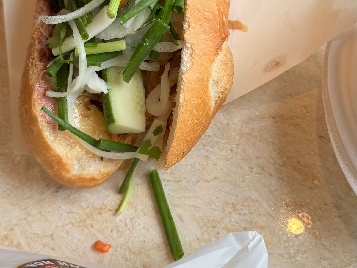パンはサクサクふわふわでパテとソーセージがたっぷり入っていて野菜は別袋にパンに入りきらないぐらいもらえて自分好みのバインミーが作れます。