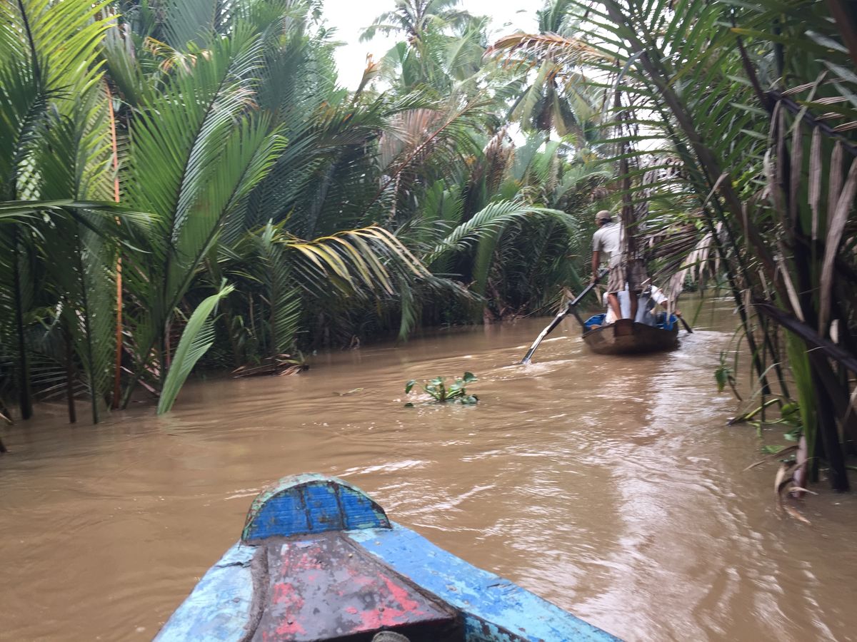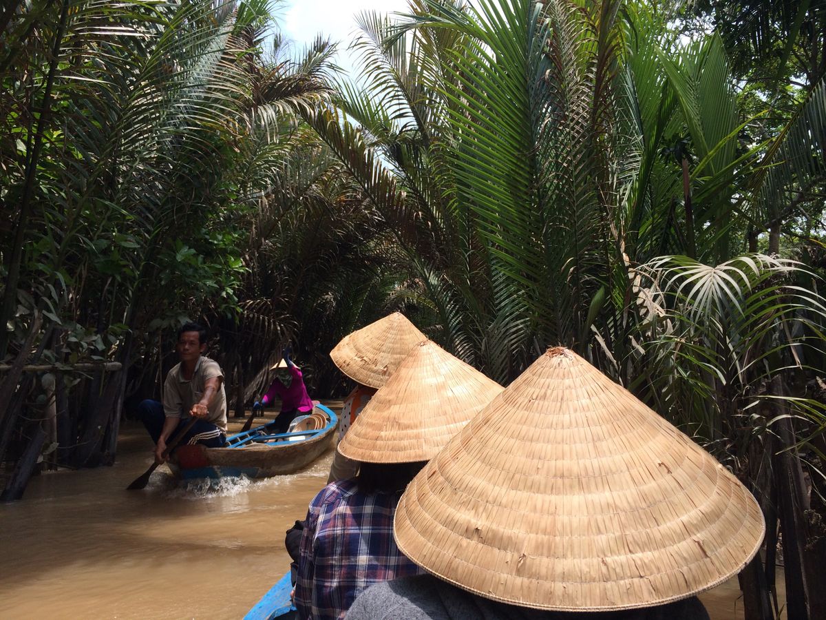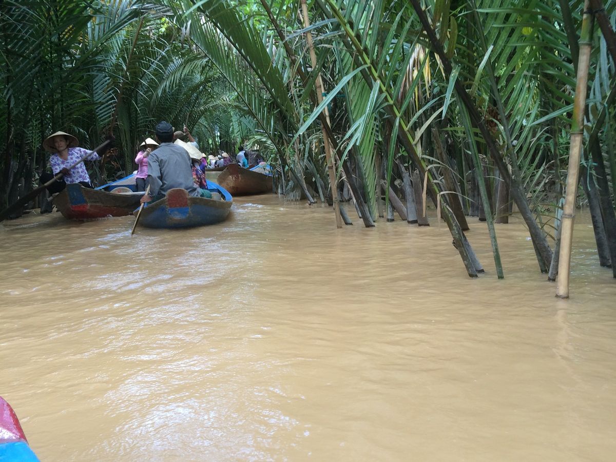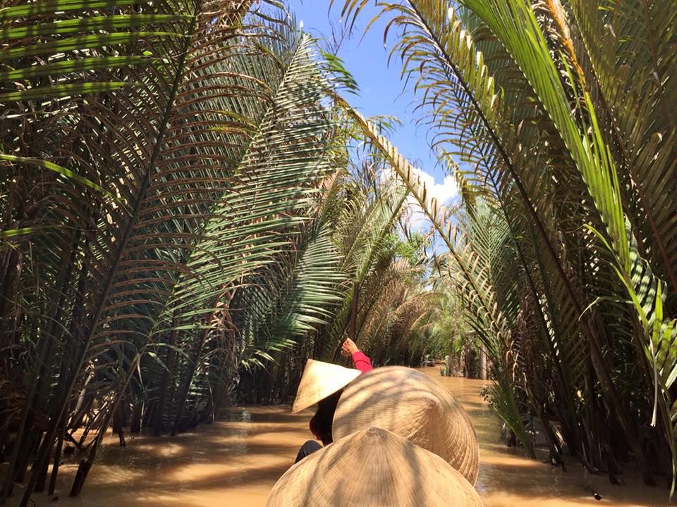 途中綺麗なパーキングエリアのようなところでトイレ休憩もしつつ、ジャングルのような中を少し歩いたのち、現地でとれたフルーツを民族音楽を聞きながら食べ、ベトナム情緒溢れる手漕ぎボートに乗りました。濁った水の上を渡るのはちょっと怖かったですが、楽しかったです。