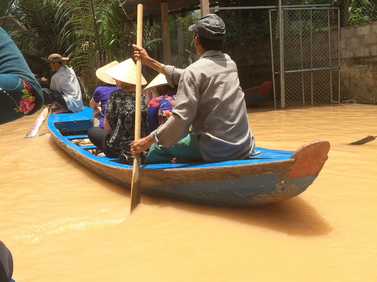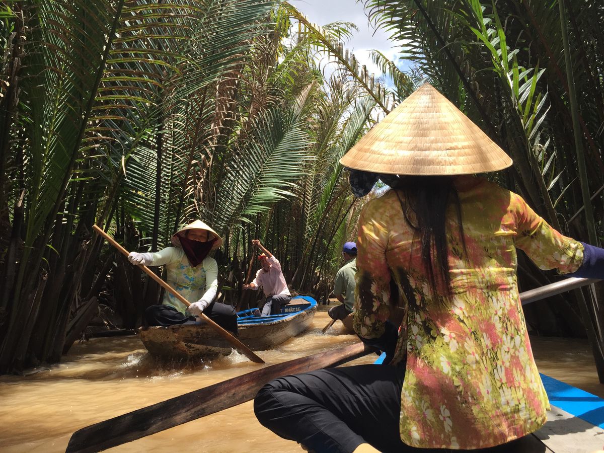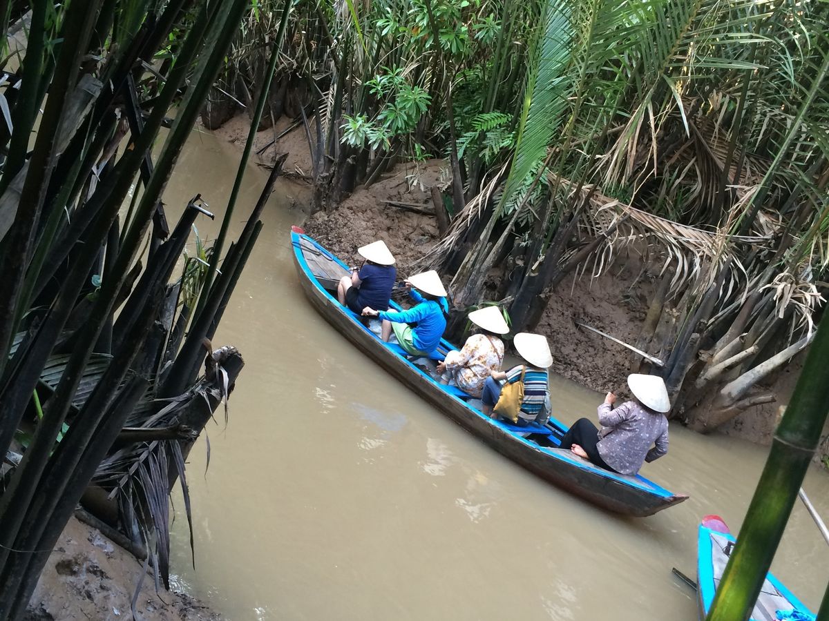 途中綺麗なパーキングエリアのようなところでトイレ休憩もしつつ、ジャングルのような中を少し歩いたのち、現地でとれたフルーツを民族音楽を聞きながら食べ、ベトナム情緒溢れる手漕ぎボートに乗りました。濁った水の上を渡るのはちょっと怖かったですが、楽しかったです。