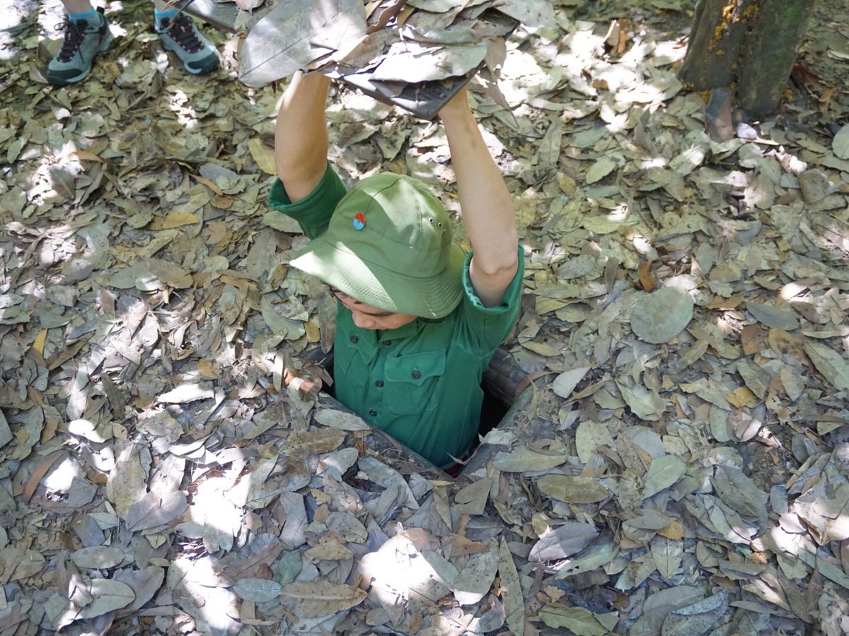 ベトナム戦争時に使われていたトンネルを実際に通ります(数分の短い距離)。当時の主食だったお芋も食べました。