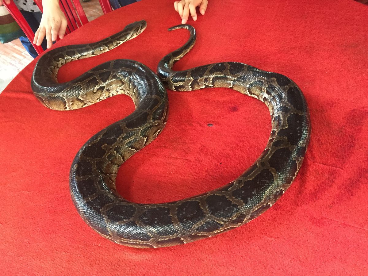その後ココナッツキャンディの製作過程を見学し(本当にココナッツを砕いたり搾ったり煮たりしており社会科見学のよう!)ニシキヘビ(優しさに溢れている)とも記念撮影。また小型船でクルーズし、お腹が空いてきたところでベトナムらしい夕食にありつけます。