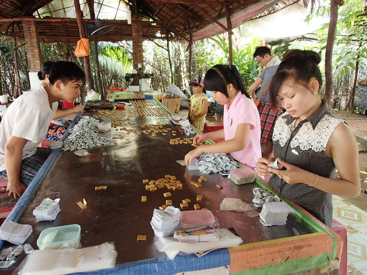 メコン川が渋滞していたのには正直どれだけ時間かかるのだろうと心配しましたが、間をうまくねっていくので感心しました。島自体も飴つくりをみたりお土産を買うこともできたり、楽しめます。そして何より帰りに寄ったレストランが素敵で、演出もあって、食事も期待以上においしかったです。お勧めです。
