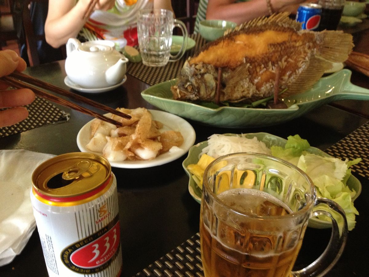 メコン川に到着し、マングローブでを手こぎボートで移動する際に土砂降りに遭いましたが、借りたベトナム三角傘が役に立ちました。その後、船に乗り換え、メコン川の雄大さを感じながら着いた昼食先では、メコン川で捕れたエレファントフィッシュという大きな魚の素揚げ(ほぐして野菜と共にライスペーパーに巻いて食べます)や、ベトナム風やきそば、スープ、揚げ春巻き、現地ビール(別料金)を頂きました(4~5人で1つのテーブルにつき、大皿で食べます)。蒸し暑い気候の中でのビールは本当に最高でした♪