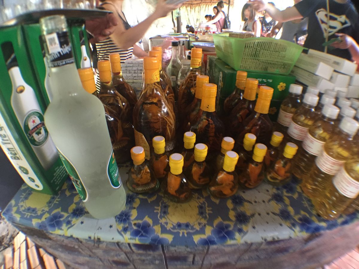 その他のアクティビティとしては、ココナツキャンディ工場見学(工場と言っても野外で作っている所を見るだけ)や果物や蜂蜜入りジャスミンティーの試飲、ニシキヘビ首巻き体験、民族楽器の演奏が聴ける等々、なかなか盛りだくさんで楽しかったです。