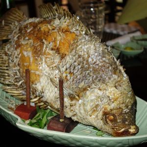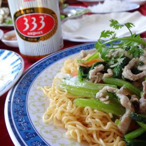 出てきたフルーツが食べ頃ではなく、ココナツジュースが生ぬるいのは他のツアーも同じ。しかし、レストランは混んでいたせいもあるが、料理がなかなか出てこないとか、生春巻きの皮が乾いてカピカピだとか、食器は下げられず最後まで出たままとか、一度床に置かれた飲物の缶を食卓に載せられるなど(勘定のためらしい)、従業員があまりにも雑。皇太子も来店したらしいが、もっと料理や客の扱いがていねいな店もあるのでは、と思うし、このような店を利用するツアー会社なのか、とも思った。