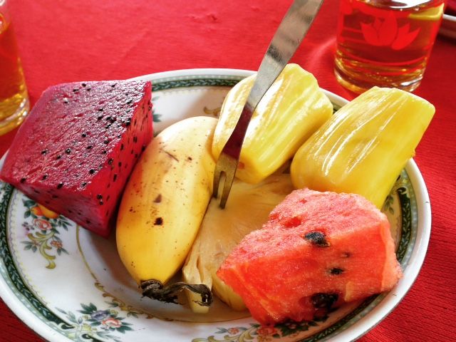 メコンデルタではフルーツ食べながら民謡を聞いたのですが、近くで歌われてチップ用のカゴをテーブルに置かれて「幸せなら態度で示そうよ〜」って歌われてもね。