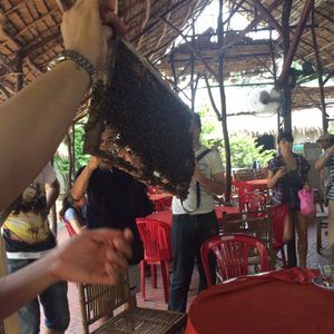 メコン川を渡るアクティビティメインで申し込みました。農園で蜂蜜とドライフルーツを試食。蜂蜜はちょっとクセがある感じですが、お土産には面白いかも。巨大なヘビにも会えました。