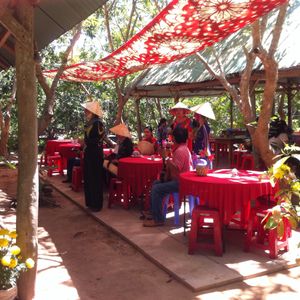 娘と二人で参加しました。ベトナムを満喫できてこの価格は、大満足。ホテルまで迎えに来てバスで移動。ミネラルウオーターを頂き、さあ、出発。メコン川の大きさにびっくり。途中で頂いたフルーツもココナツキャラメルも美味しかったです。昼食も普通においしく頂ました。グラス、皿の汚れの気になる方は、除菌ペーパーをもって行くと安心です。外で食べるのでほこりっぽいです。でもでも大満足のツアーです。添乗員の方も楽しく、親切!!