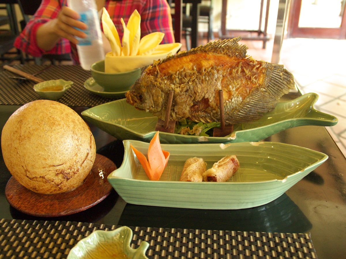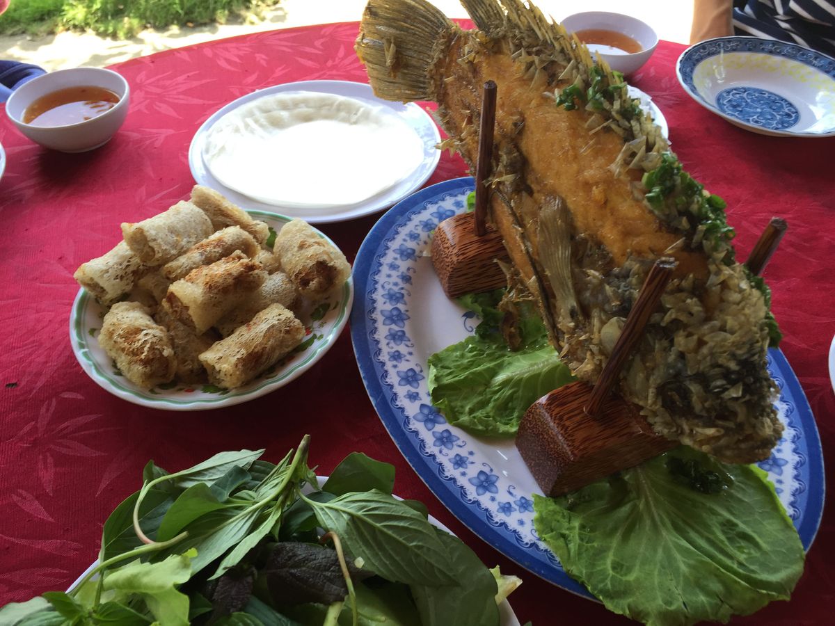 メコン川のクルーズはベトナムの戦争映画に出てくるような景色で面白かったですが、中洲の島も大きな蛇がいたり、歌や果物でのもてなしがあったり中々楽しかったです。この島で見たエレファントフィッシュのから揚げが昼食に出てきて、鯛のような触感で美味しかったです。