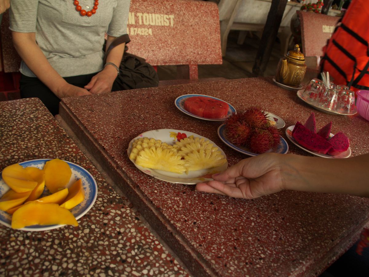 メコン川クルーズに参加する前に、フルーツを食べながらの生演奏を聴いたり、お茶の販売、ココナツキャンディーの販売などがありました。