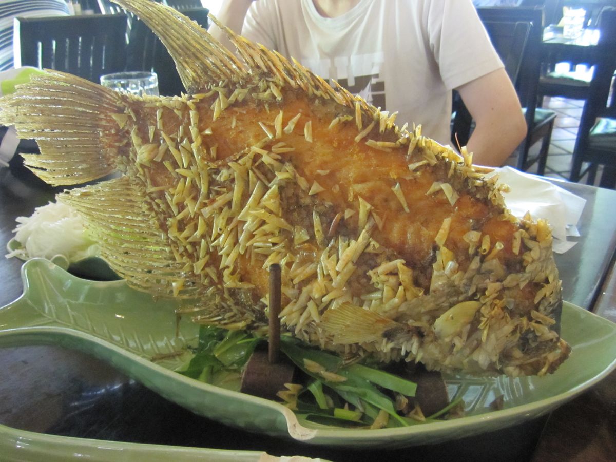 魚のフライ( エレファントフィッシュ)の丸まったうろこが表面に、それが