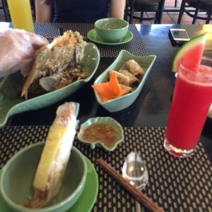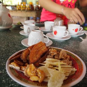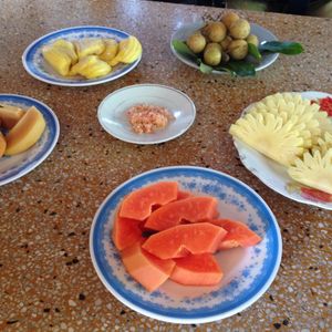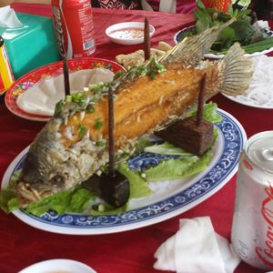 昼食は、日本でもよくある近郊の観光客対応大型ドライブイン?といったところです。エレファントフィッシュは4人で1匹をシェアし、ライスペーパーに巻いて春巻きとして頂きます。また、昼食の前に、デザートのみの休憩(現地ミュージシャン?の生演奏と蛇との撮影会つき)もありますが、どちらもこのツアーの価格には妥当なもので、決して「美味しい」と絶賛できるものではありません(笑)お餅のシナモン和え?のようなものを頂きましたが、それはとっても気に入ったので、帰国後マネして作ってみました。つまり、味はまずまず、ですが、そもそも35ドルしかお支払いしてないので充分です^o^