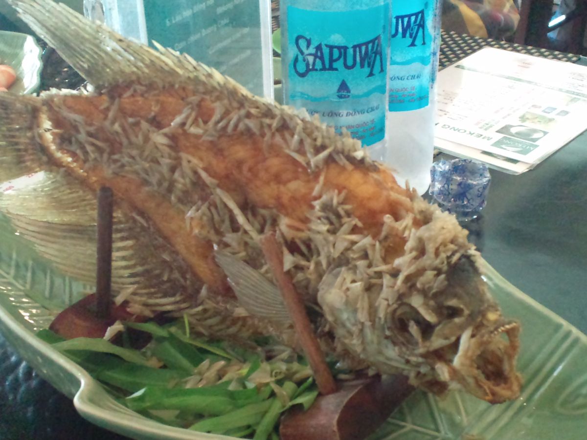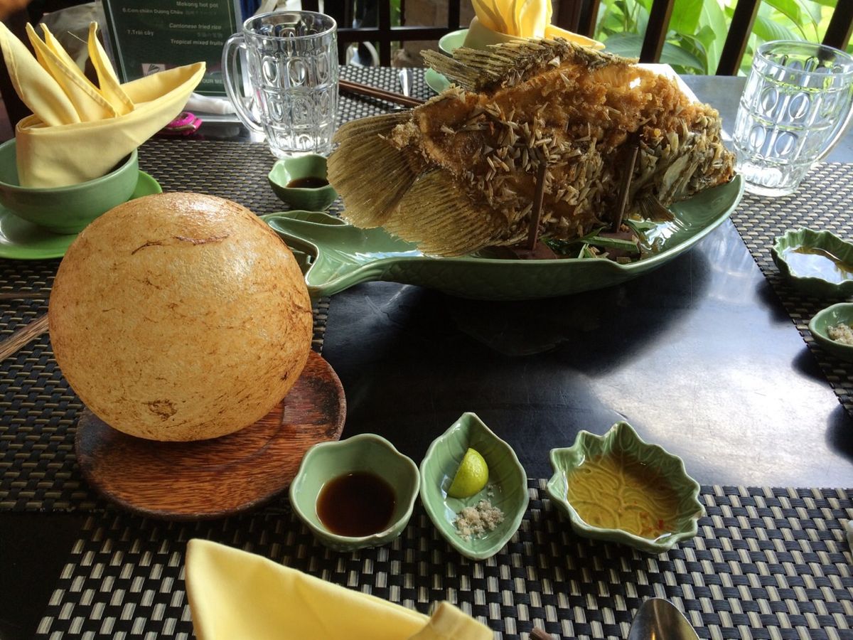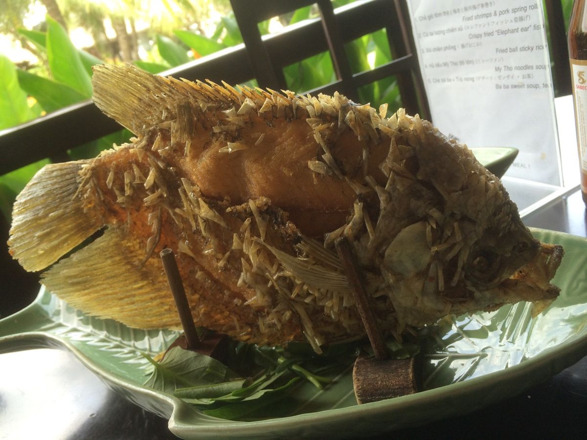 その後昼食で象耳魚をライスペーパーに巻いて食べます。タレや香草と一緒に食べれば臭みなくおいしいです。
