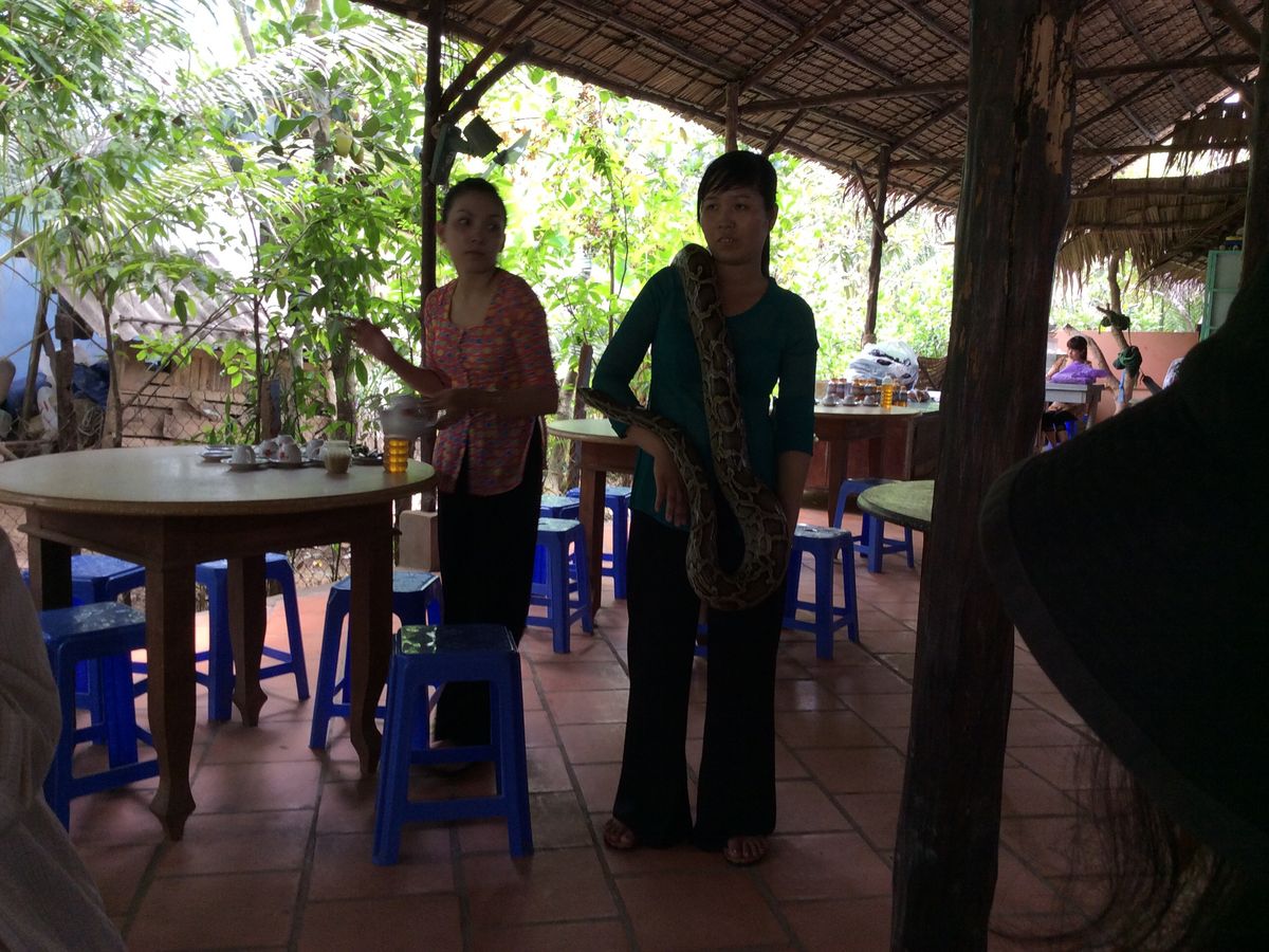 往路の車中では、ガイドさん(「ナンさん」とおっしゃっていたと思います)が、当日の行程やベトナムの文化などについて分かりやすくお話しして下さいました。また、突然の雨の際にも、すぐに使い捨ての雨具を配って下さるなど、細かく配慮して頂けました。大型バスは快適で、ミトーで乗り換えた船では、ココナッツを頂きました。その後は、キャンディー工場見学→馬車体験→フルーツ試食→民謡→首に蛇巻き体験(もちろん希望者のみです)→手漕ぎの小舟と、ベトナム初心者が楽しめるメニューがどんどん続きます。これらのサービスへのチップは、参加者の意向を確認した上で、ガイドさんが全て取りまとめて下さったので、この地域で時々起こりがちな「チップ絡みの不愉快な場面」には、全体を通して一切遭遇しませんでした。参加者の多くがベトナム初心者であるツアーで、こうした配慮は有難いです。
