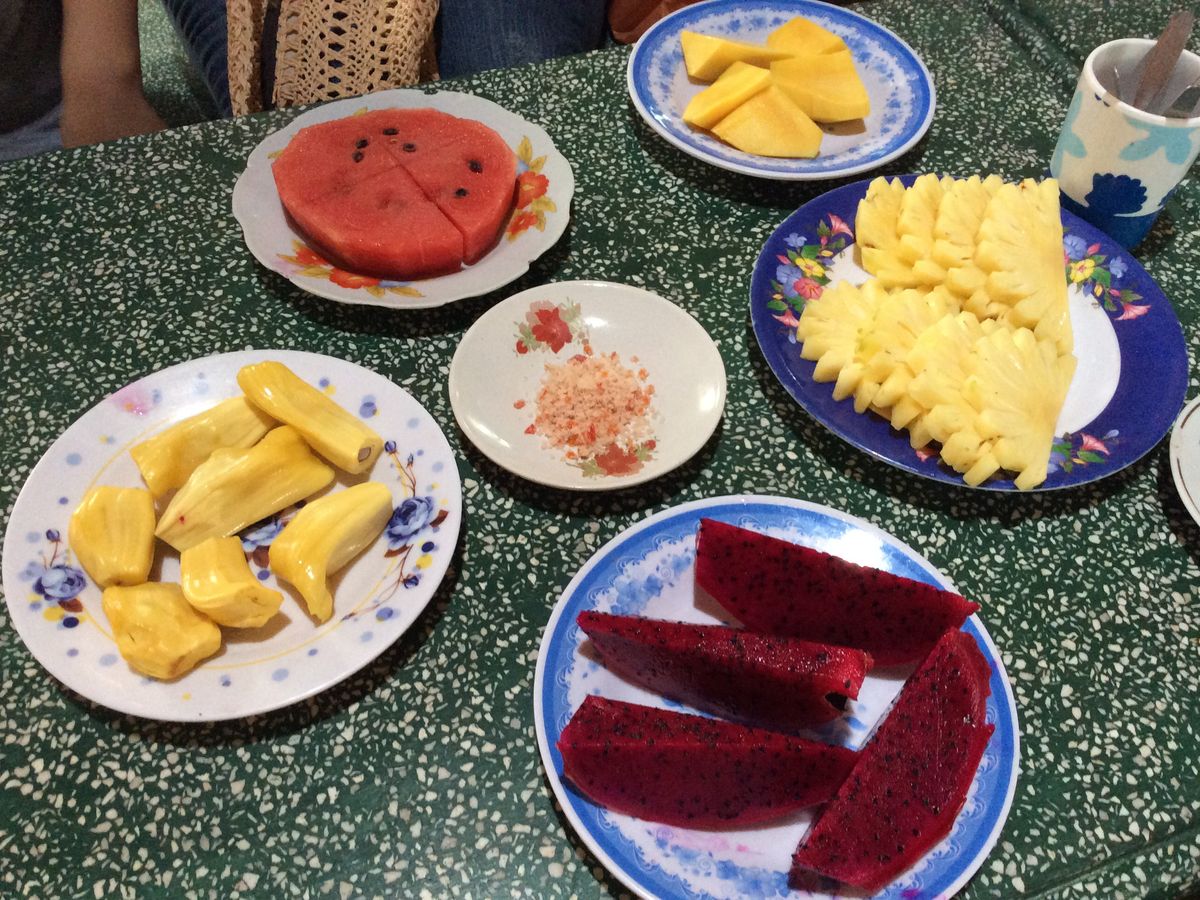 手漕ぎ舟が終点に着くと、小舟から中型船へと水上で乗り換えて、川沿いのレストランに船から上陸ました。事前の下調べで「昼食会場へはバスで移動」という旅行記も拝見しておりましたが、この日は船での移動でした。もちろん、船での移動の方が断然気持ちが良く、旅気分も盛り上がったのでラッキーでした。昼食は長テーブルの相席で、少しずつ料理が出されるので、最初は他人同士お互いに遠慮し合いながら食べ始めましたが、最終的なトータルでは、特に遠慮し合わなくても大丈夫なくらいの量があった感じでした。飲み物は別料金で、だいたい現地コンビニ価格の2〜3倍程度でした。ベトナムや東南アジア初心者が多かったので、試食するフルーツの種類や料理の食べ方などの解説が充実していれば、より一層楽しめたと思います。