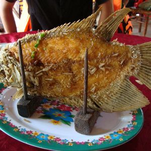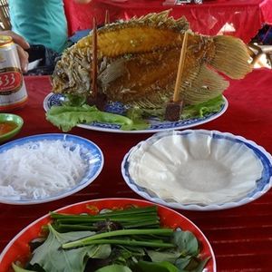 早めの夕食は有名なエレファントイヤーフィッシュの姿揚げ。春巻きにしてくれます。味は白身でさっぱり、カリカリしていました。6人参加で1匹。