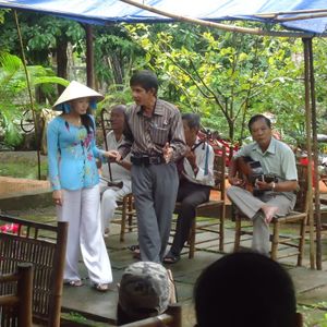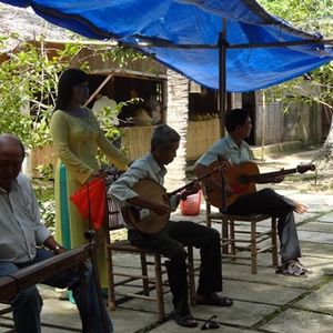 フルーツを食べているときにベトナム伝統の歌を披露してもらいました。市内でもアオザイをあまり見かけないので、アオザイが好きな方はここで一緒に撮影してもらってください。歌に対してチップ要。金額の目安は一人2万ドン(1ドル)です。