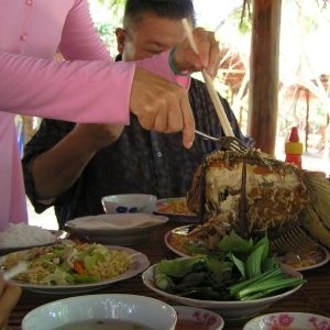 ホテルへのお迎えは、ガイドさんと運転手さんつきのアジアではおなじみのパターン。この日は私たちともう1組計4人のピックアップでした。ところが、車で5分ほどの会社の前で大型バスに乗り換え、ヨーロッパの方々のツアーに合流しました。~安さの秘密はここにあったのか~と納得!バスの前方には英語ガイド、後方には、私たち日本人のための日本語ガイドが乗り、丁寧に説明してくれました。日本人ツアーは8名だったので、ガイドさんに直接質問することも十分できました。普段、アジアの観光では、一家族一台の車で一日中ガイドさんの話に相槌を打たなくてはならずちょっと疲れることも・・・。でも、今回はそんな心配もなく、ガイドさんや他のお客さんとも仲良くなりとても楽しい一日でした。そして、昼食には他のお高いツアーと同じようにエレファントフィッシュをいただきました。はっきりいってこの値段では食べられないと思っていたのに、感激でした。