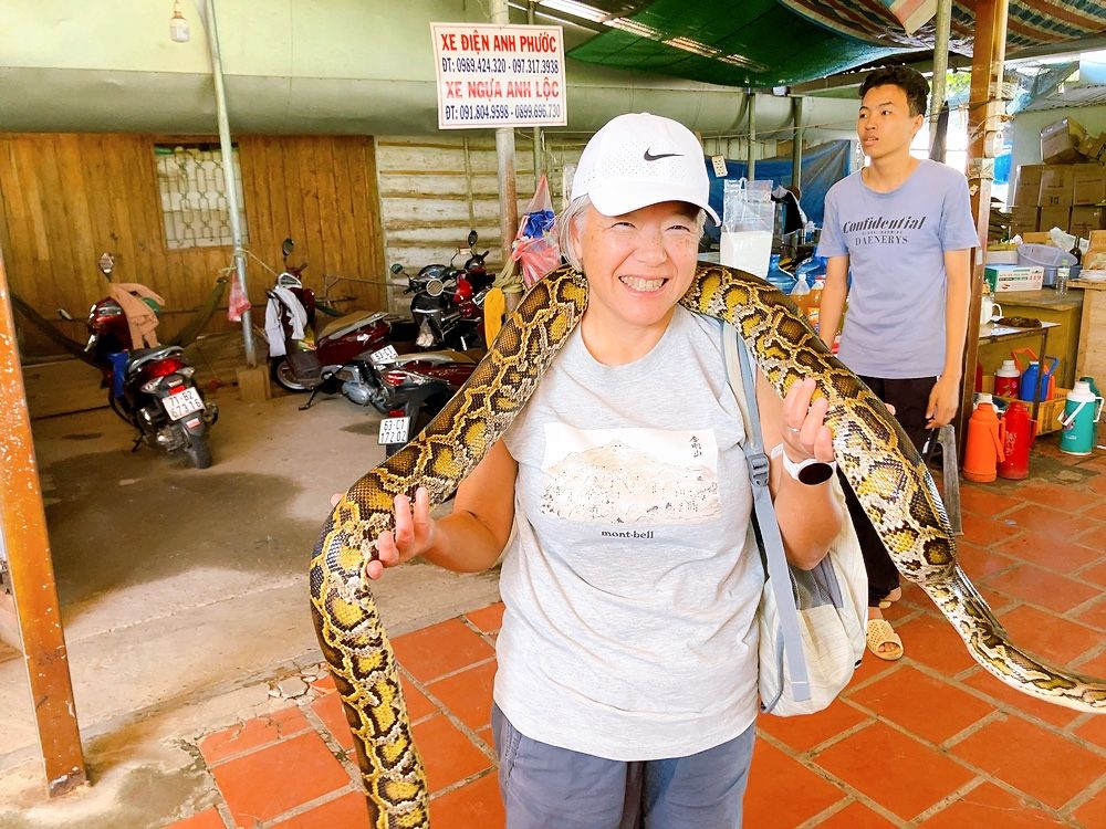 29日も朝から晴天で、メコン河クルーズで島に降り立ち、現地の特産品の生産所見学や植物園散策、ニシキヘビとのツーショット、そしてメコン川での手漕ぎボートに揺られながらの時間も楽しかったです。お昼には、エレファントイヤーフィッシュやフォーや揚げちまきなどの美味しいランチも楽しみました。
