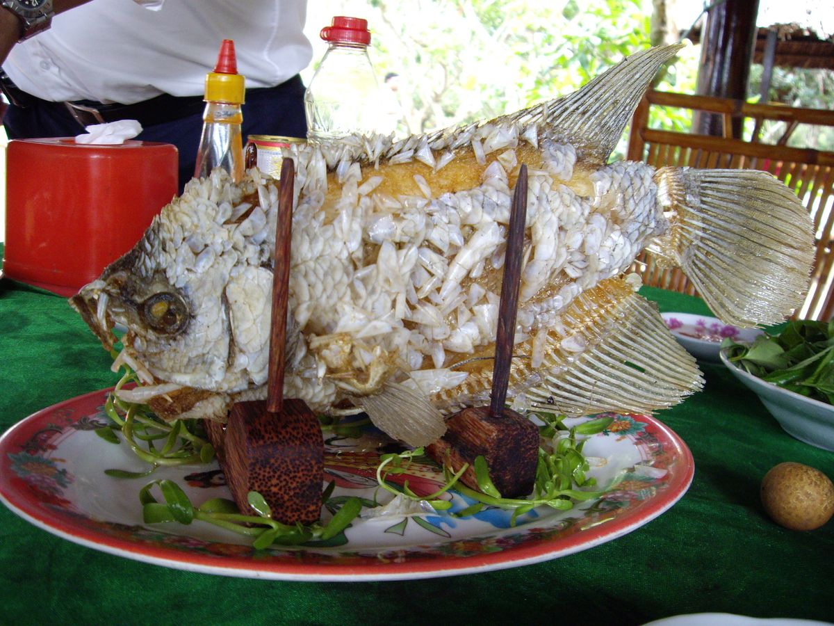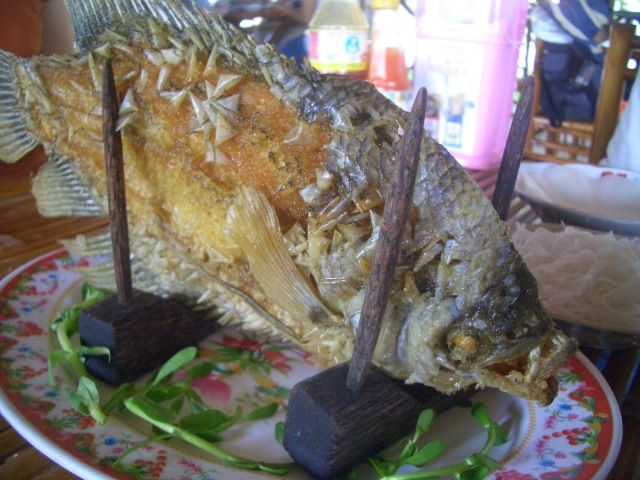 小さいボートに乗り換えて中州を廻り、ココナッツアメ工場や蜂蜜加工所へ行ったり、果物や昼食を頂いたりしました。 象耳魚というのも体験しました。