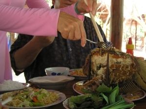 ホテルへのお迎えは、ガイドさんと運転手さんつきのアジアではおなじみのパターン。この日は私たちともう1組計4人のピックアップでした。ところが、車で5分ほどの会社の前で大型バスに乗り換え、ヨーロッパの方々のツアーに合流しました。~安さの秘密はここにあったのか~と納得!バスの前方には英語ガイド、後方には、私たち日本人のための日本語ガイドが乗り、丁寧に説明してくれました。日本人ツアーは8名だったので、ガイドさんに直接質問することも十分できました。普段、アジアの観光では、一家族一台の車で一日中ガイドさんの話に相槌を打たなくてはならずちょっと疲れることも・・・。でも、今回はそんな心配もなく、ガイドさんや他のお客さんとも仲良くなりとても楽しい一日でした。そして、昼食には他のお高いツアーと同じようにエレファントフィッシュをいただきました。はっきりいってこの値段では食べられないと思っていたのに、感激でした。