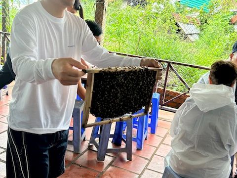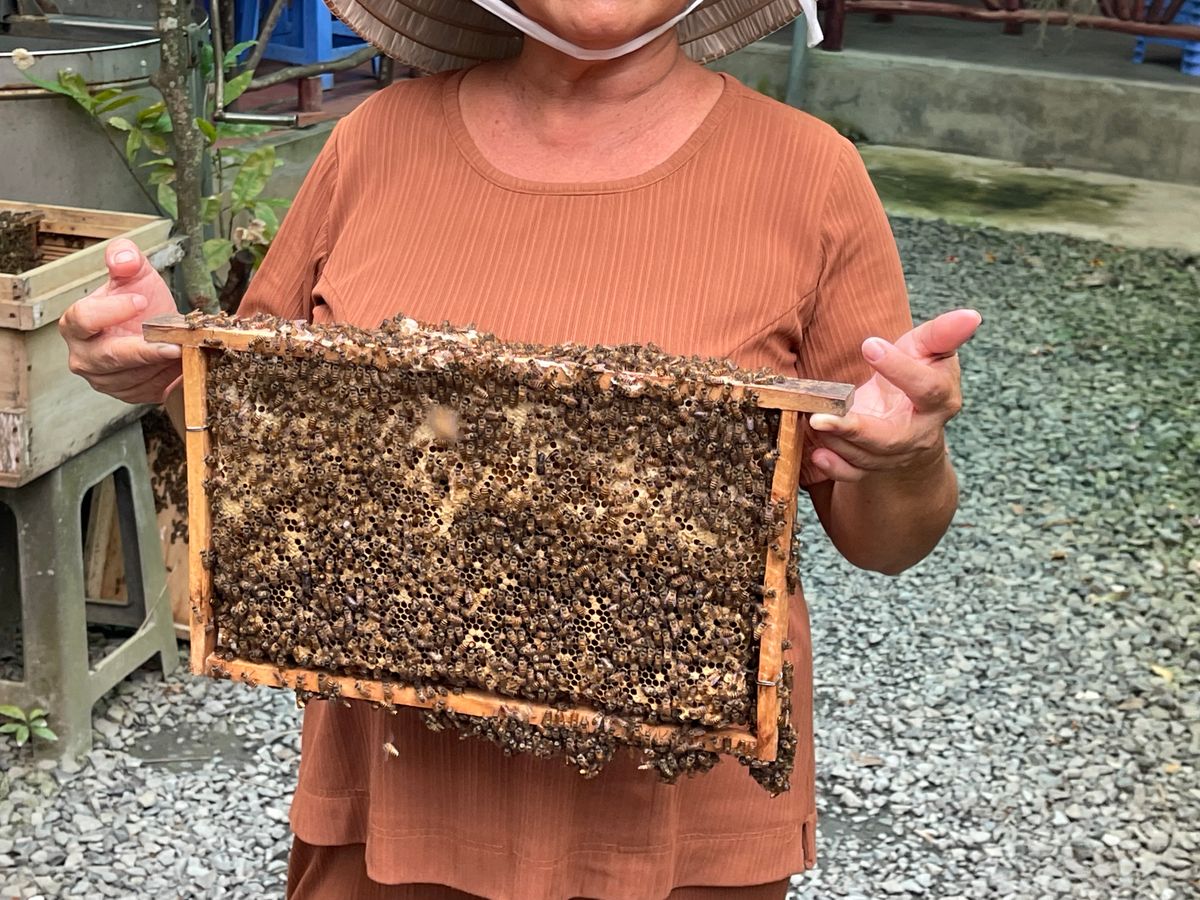 まずはボートで島へ渡りますが、ノンラーのサービスがあり、ベトナム気分が高まったところで、ハチミツ農園を訪れます。