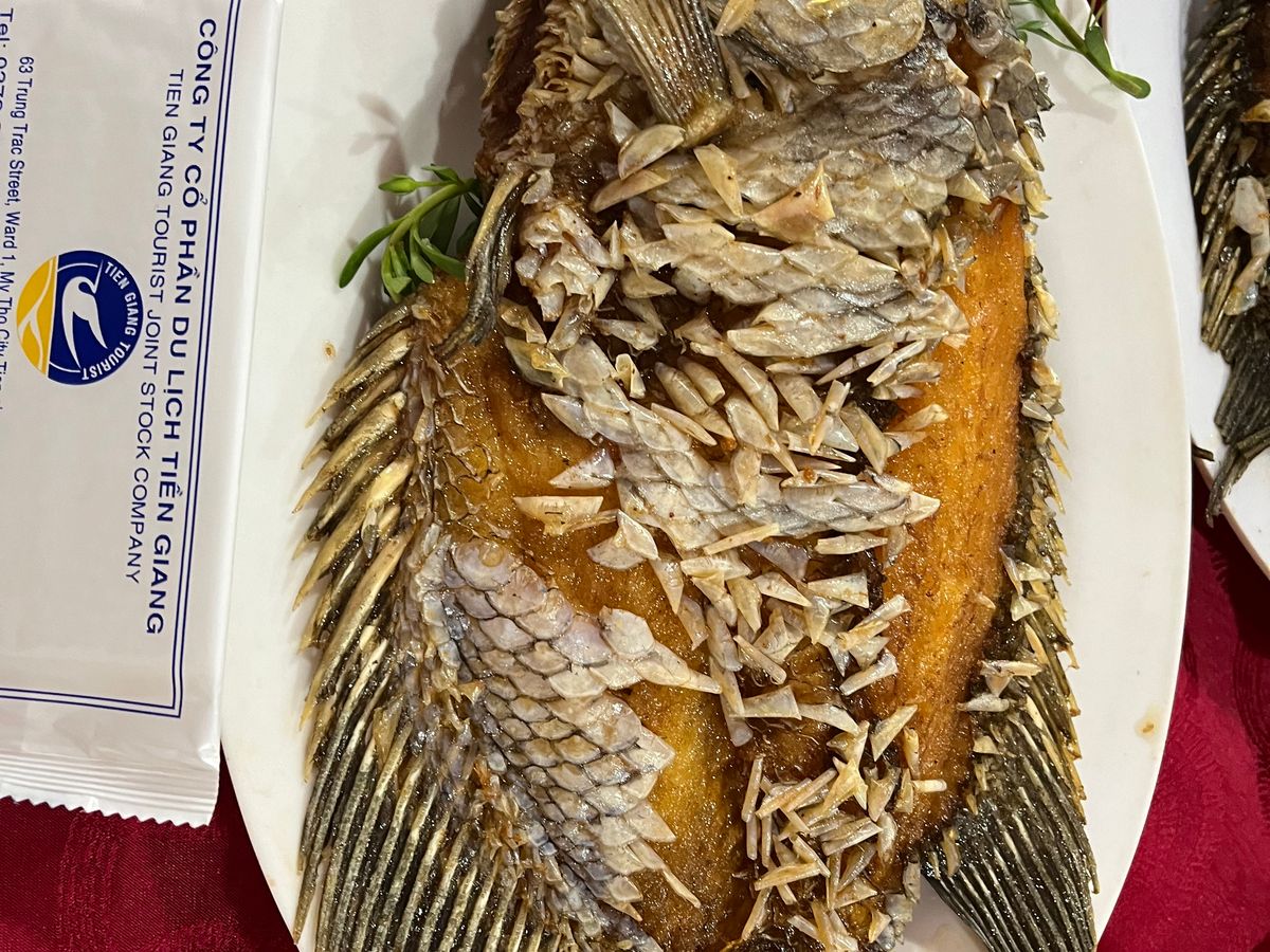 手漕ぎボート 半強制的に1人1万ドン(60円)チップ払うけど 15分も漕いでくれて タダで三角帽子を貸してくれた。雨が降ると被るビニールも貸してくれて ベトナム人の親切さを感じた。ずぶ濡れになったけど とても楽しかったです。1回は体験する価値ありです。象耳魚は まあまあ。ミトーまで70Kmあるけど 途中 高速を走るので片道1時間半くらいでした。手漕ぎボートに乗る前 錦蛇を肩にのせて写真を撮る体験が タダでした。蛇 湿布貼ったみたいな体感で面白かった。