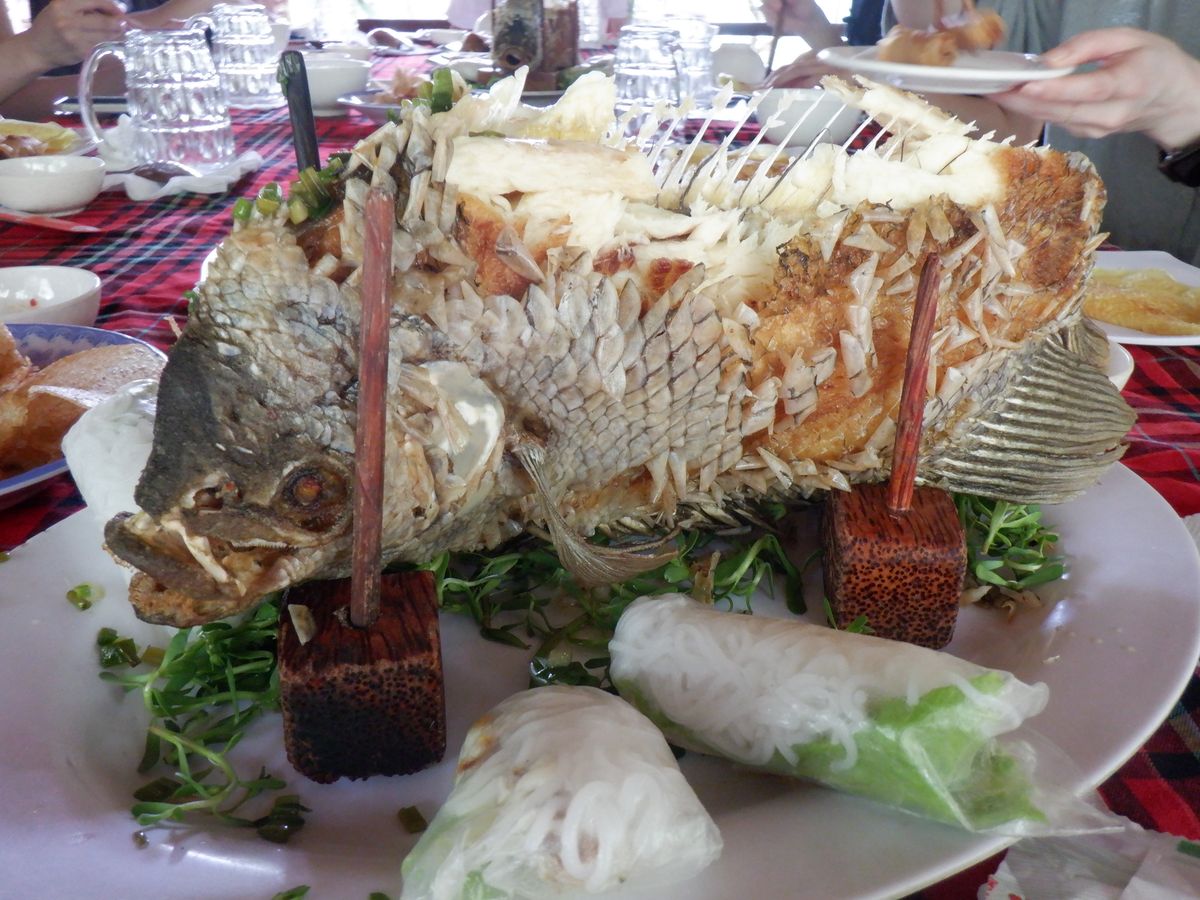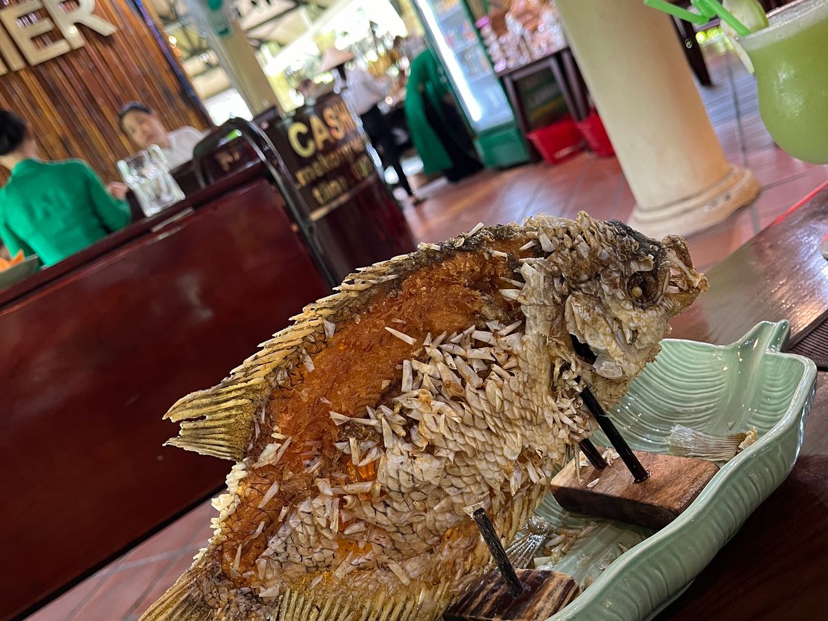 象耳魚の姿揚はメコンの名物料理でデモンストレーションも楽しいので動画に収めてしまうお気持ちが分かります。