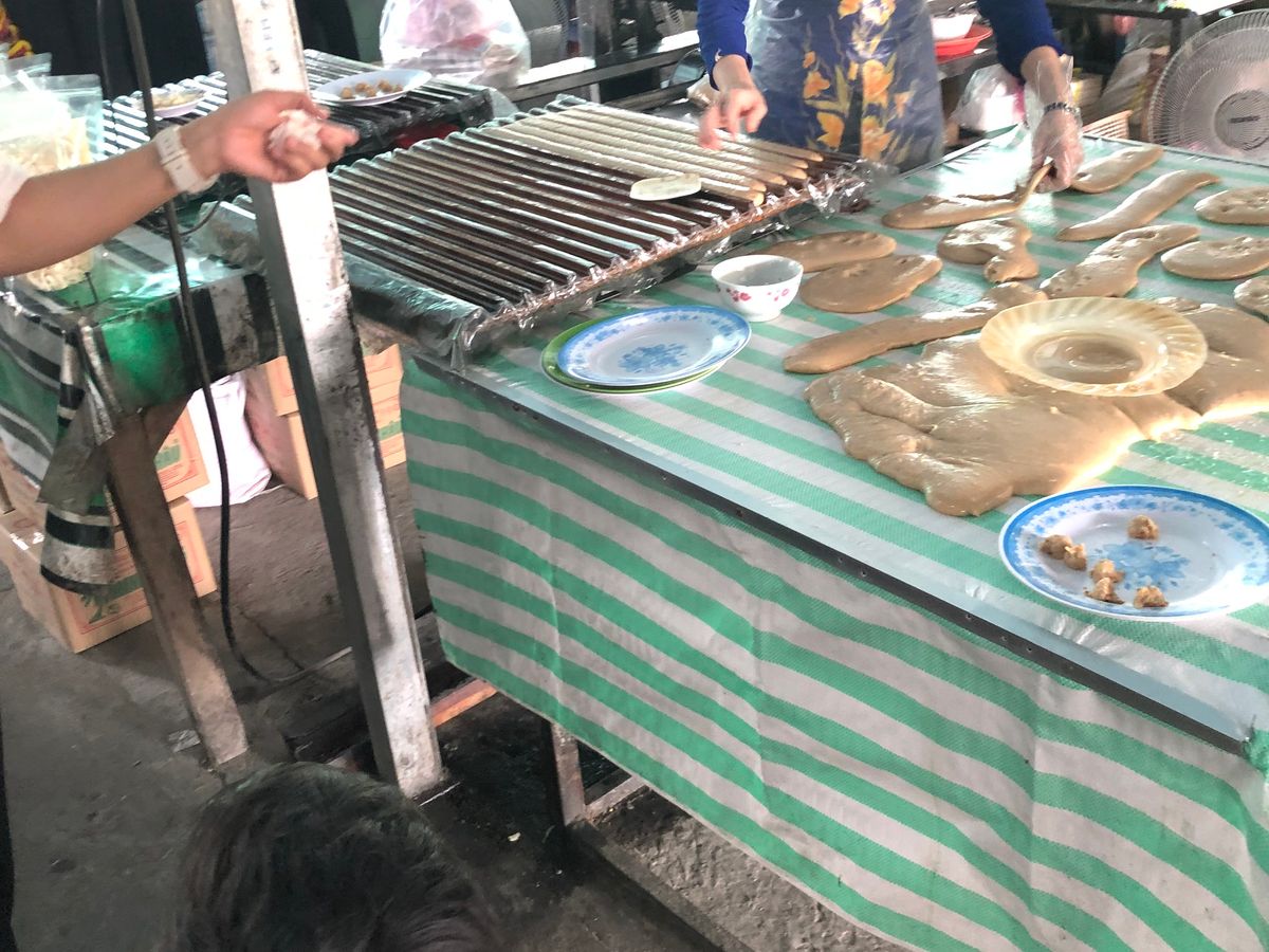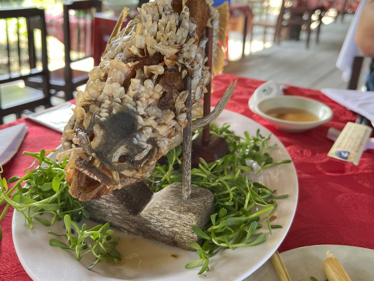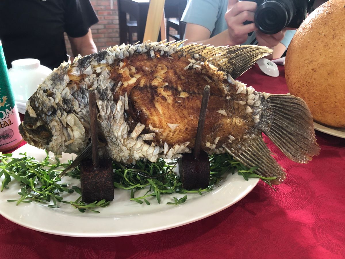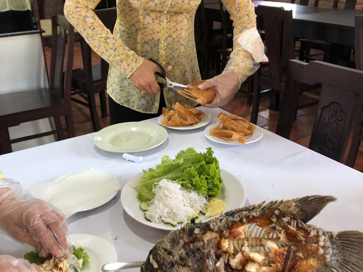 食事は郷土料理ということでしたが、象耳魚の姿揚はライスペーパーに野菜と一緒に巻いて食べるのですが、最初にデモンストレーションで一人に一つづつ作ってくれたので、思わず動画に収めてしまいました。