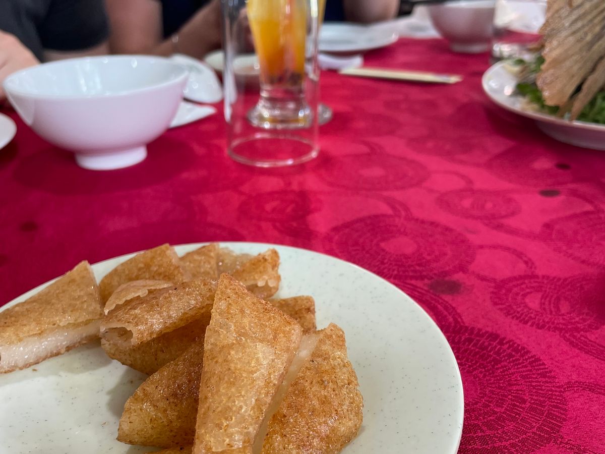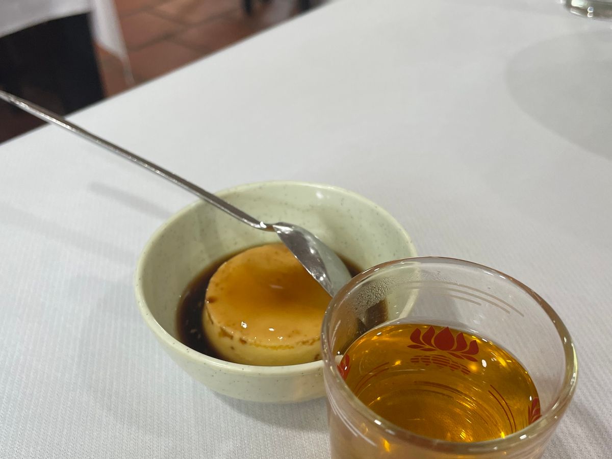 遅めのお昼ご飯はエレファントフィッシュ、餅、白キクラゲのスープ、フォー、プリン。