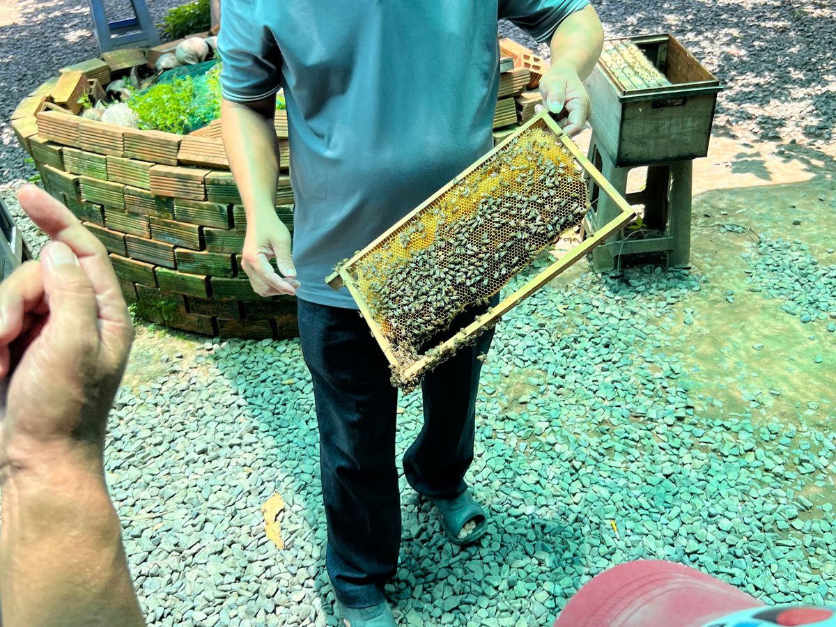 はちみつの試食時は、ずっと周りをミツバチが飛んでおり非常に怖かったです。刺すことは基本ないそうですが。。
