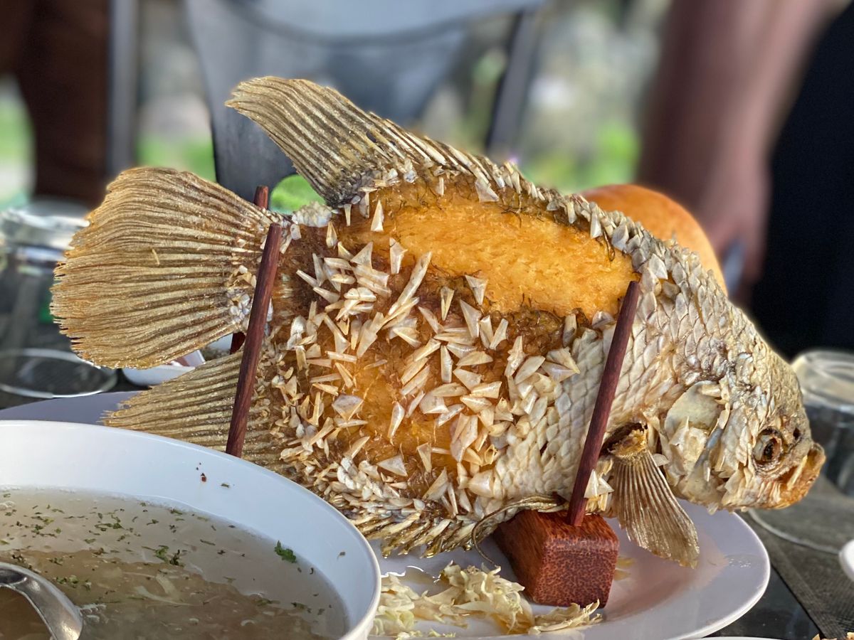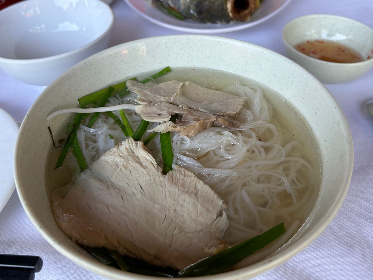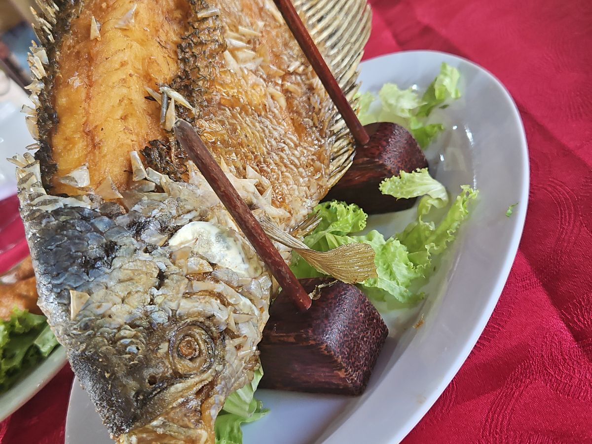 そこで、象耳魚の巨大なお魚のフライと、フォーなどいろんなといただきました。