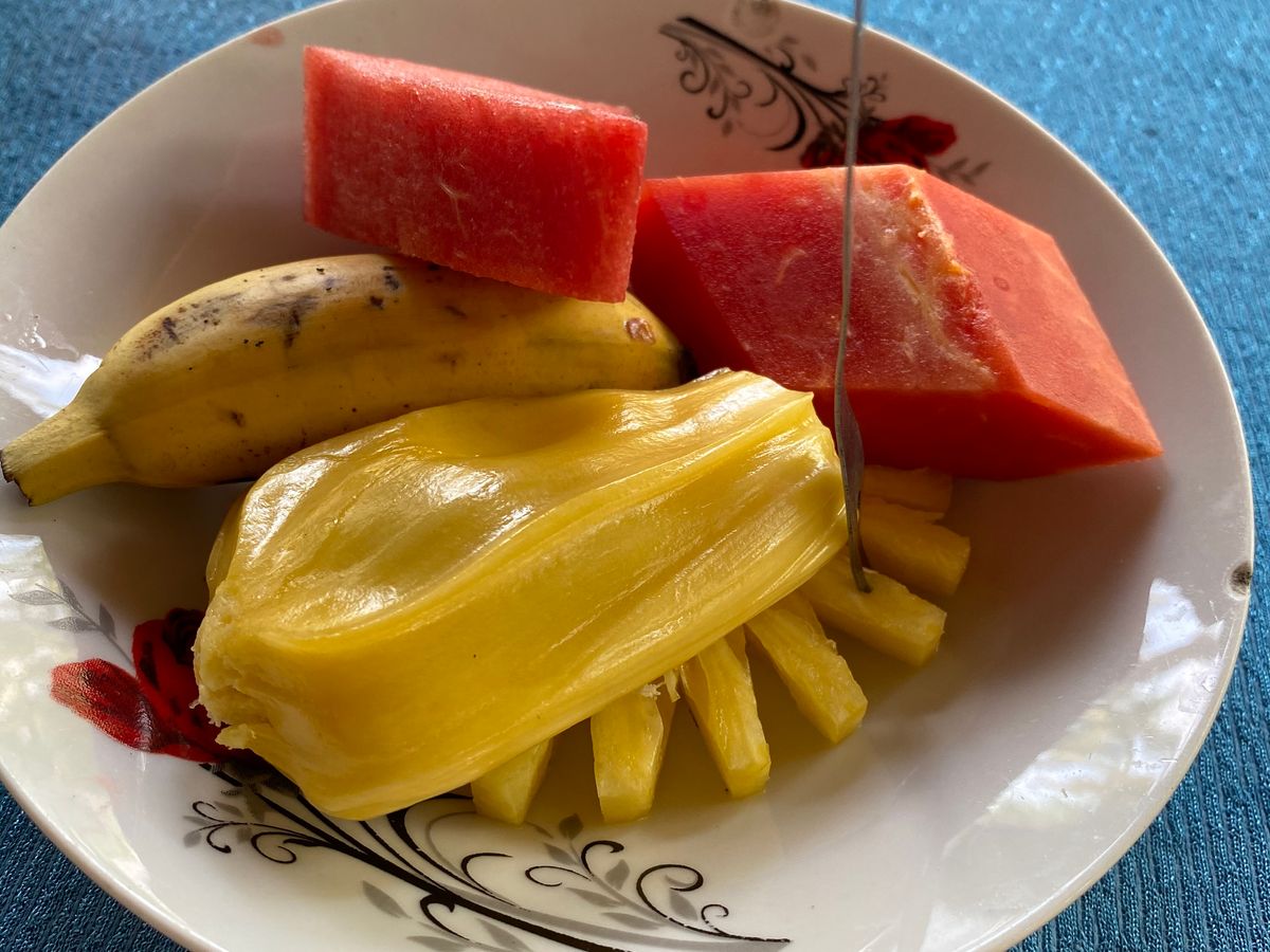 象耳魚とヌードルのランチ。ガイドさんが手早く捌いてくれました。島の果樹園で採れたボンタンジュース(別料金)は最高!