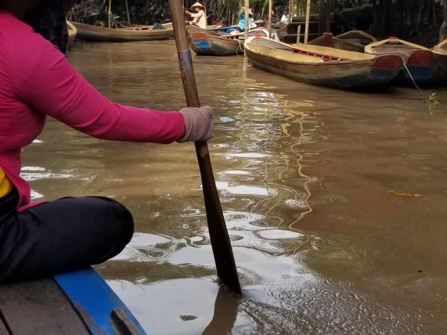メコン川クルーズの中で手漕ぎ船を行くのがありました。4人1組で私は1番後ろに。