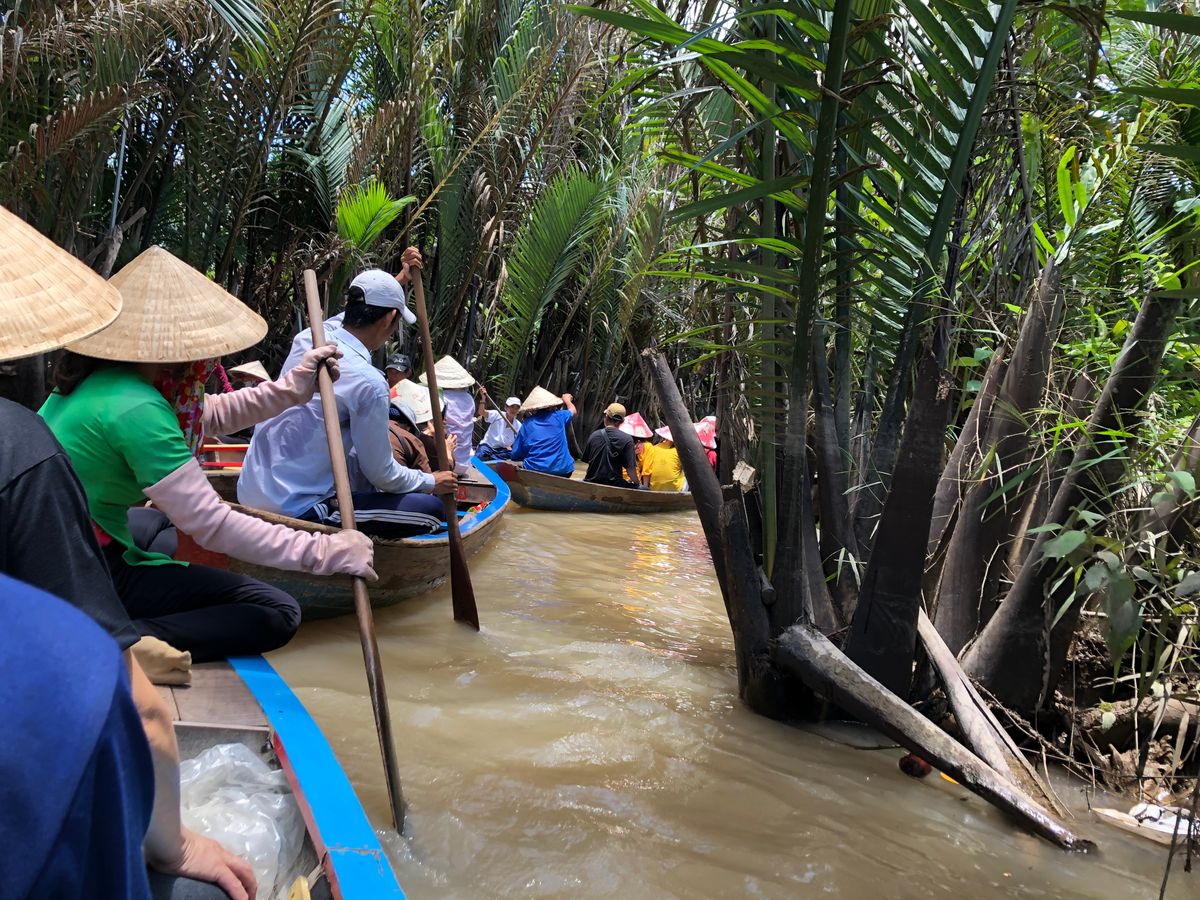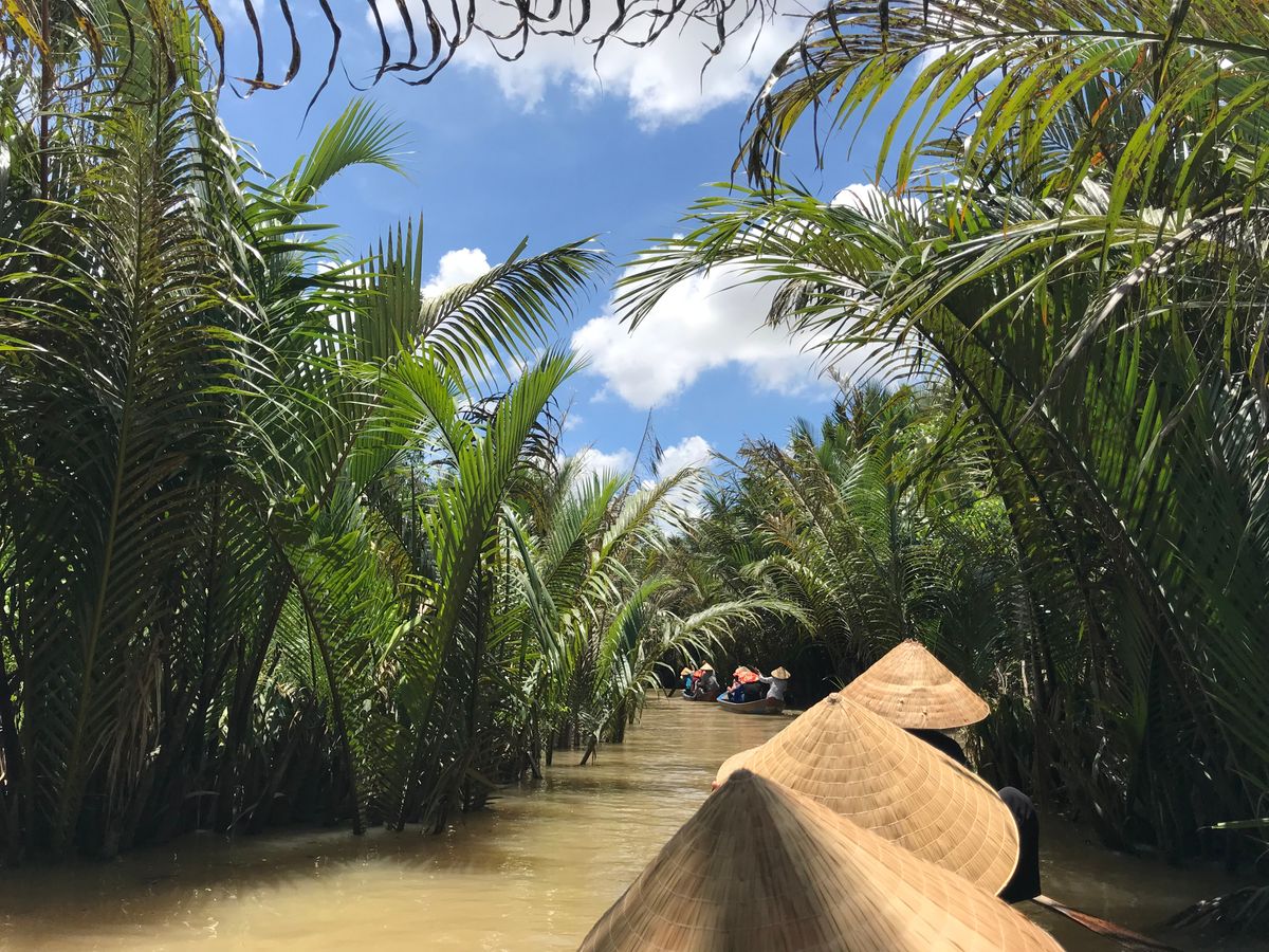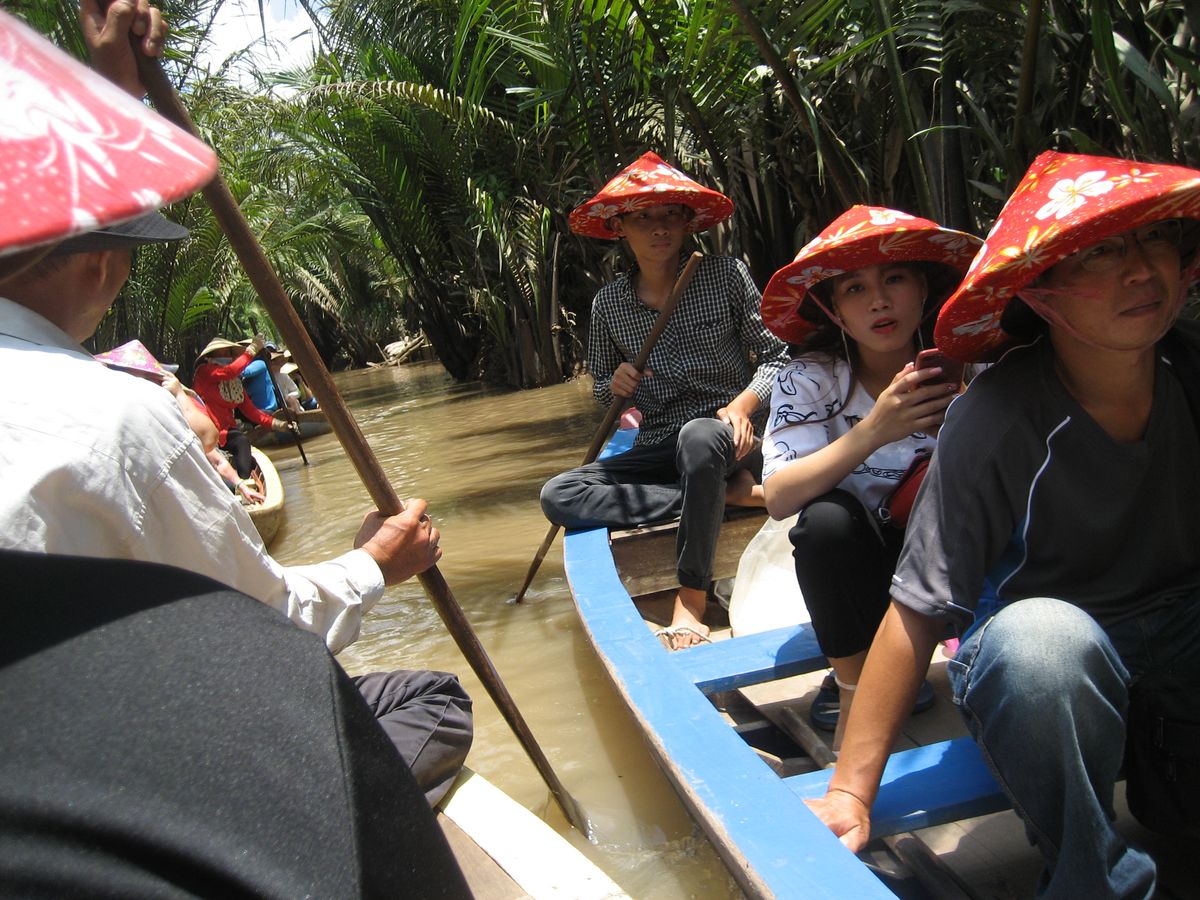 手漕ぎボートは狭い川を意外とスピードで進むのでスリリングです。陽射しが強いですが、ベトナムらしい笠を被ることが出来て雰囲気が盛り上がります。