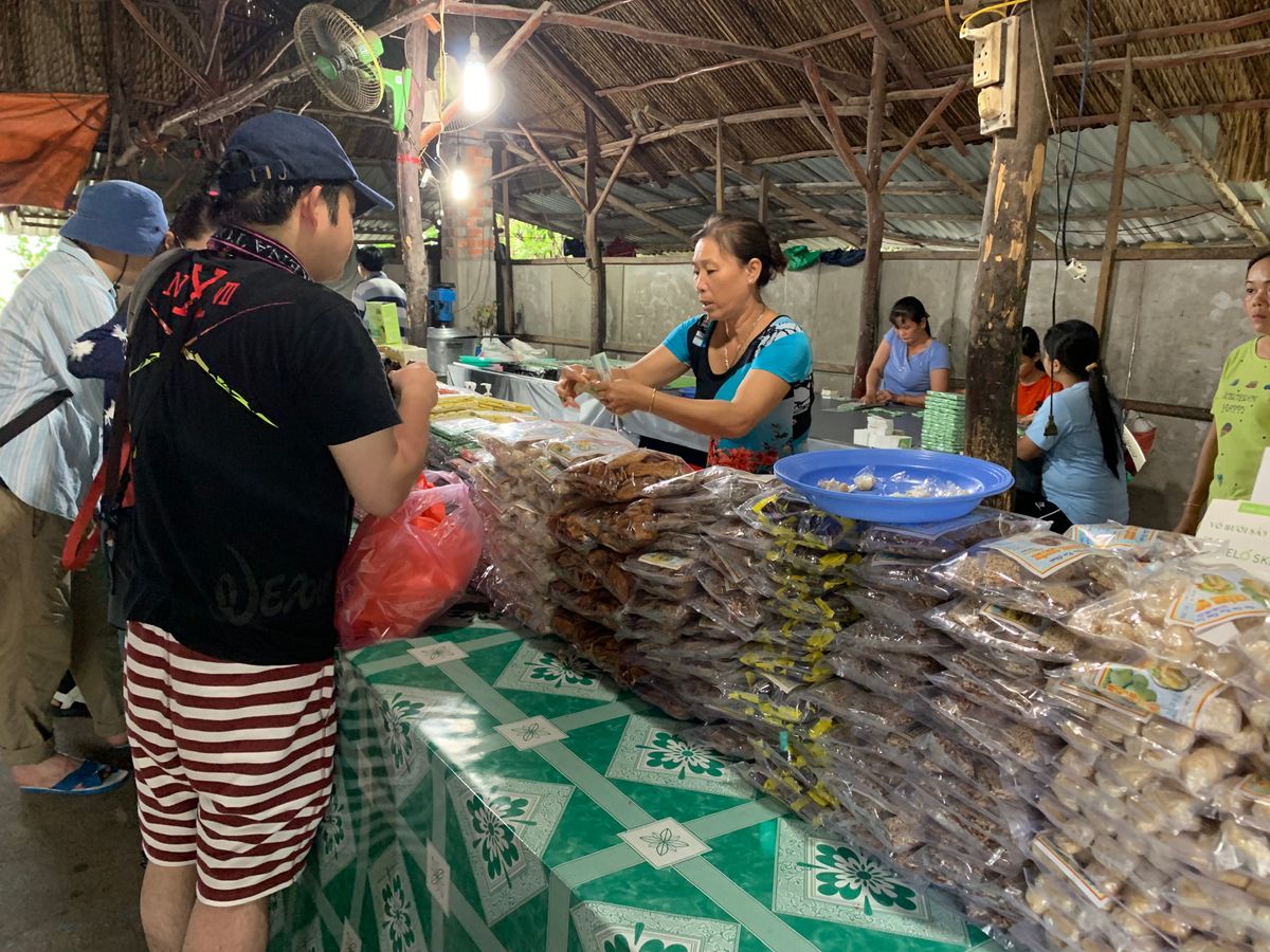 メコンデルタでは中州で現地の人の生活を見れたり、果物やお茶などの試食がたくさんあり、ばらまき系のお土産も安く購入できました。