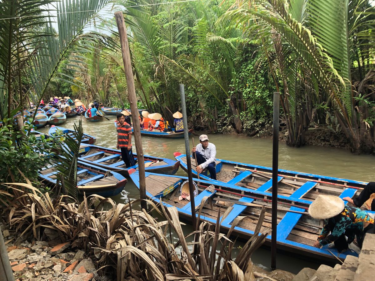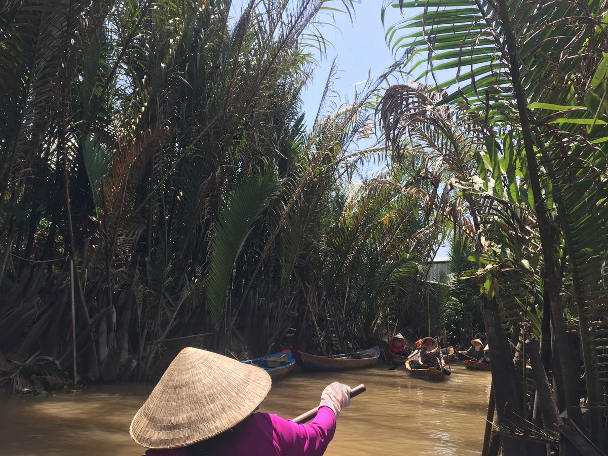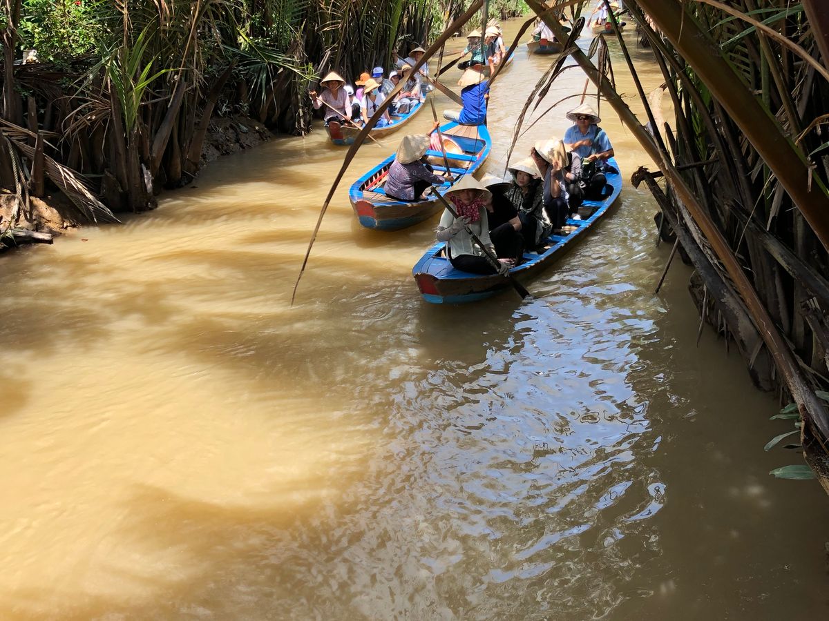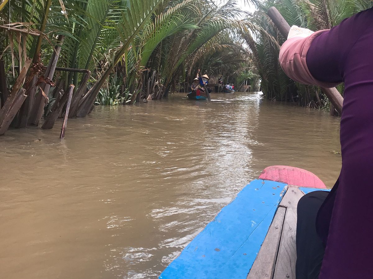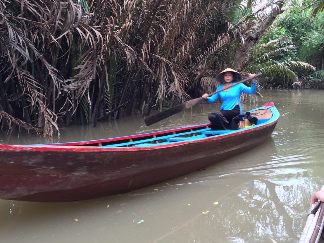 メコン川のクルーズは一列になって川下りをし、ベトナム感を味わえます。