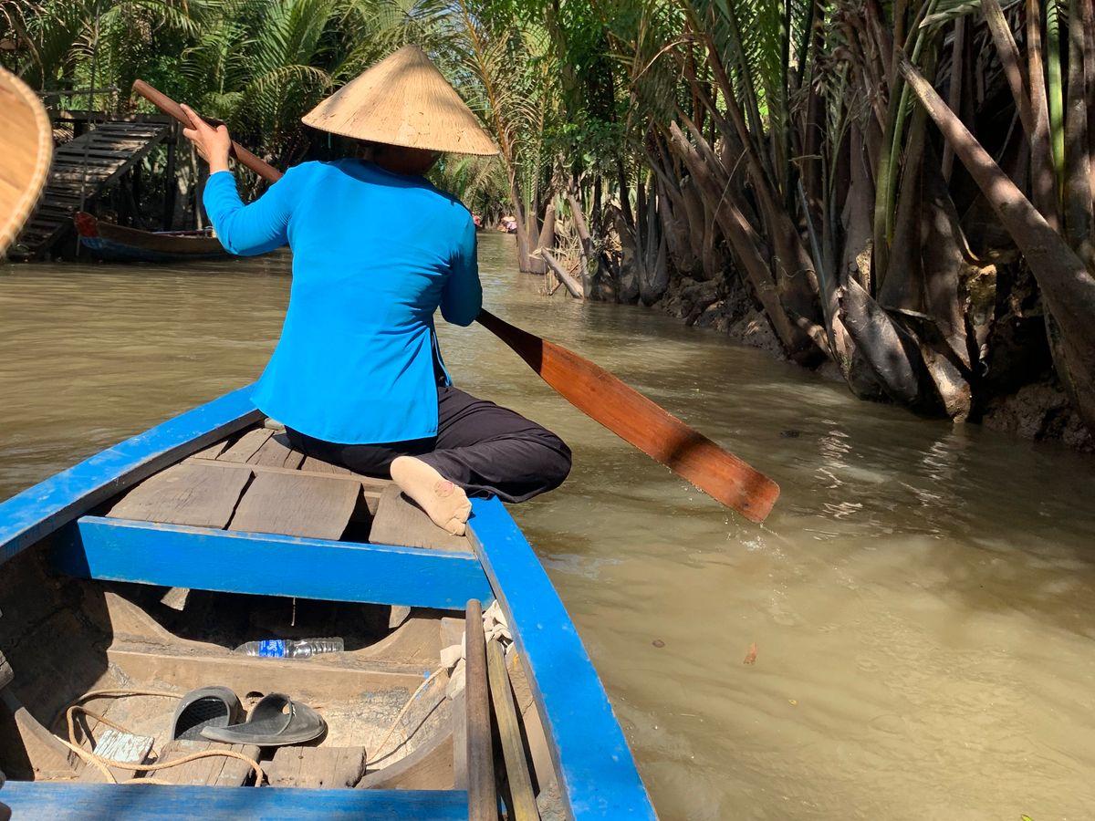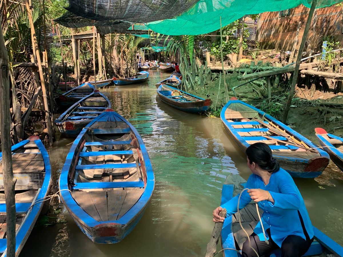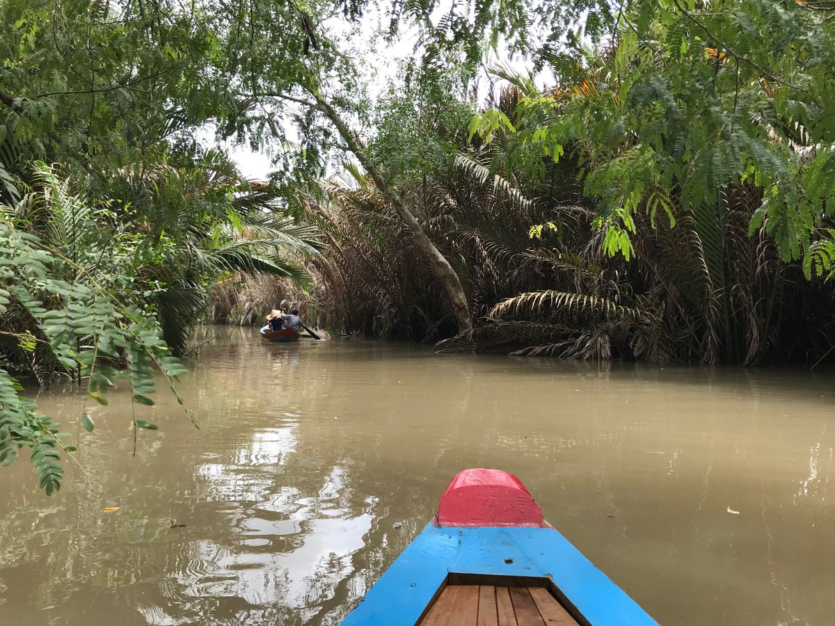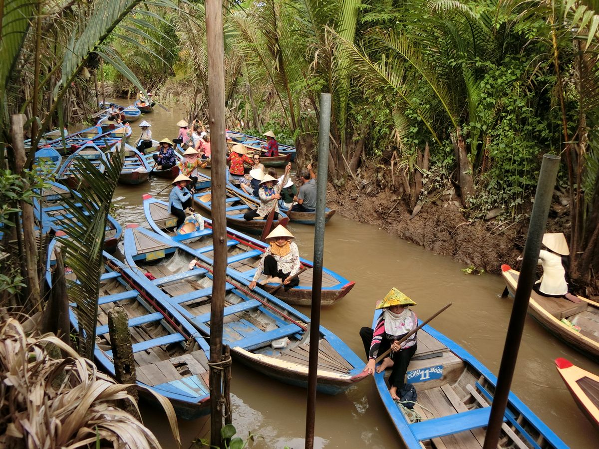 メコン川のクルーズは一列になって川下りをし、ベトナム感を味わえます。