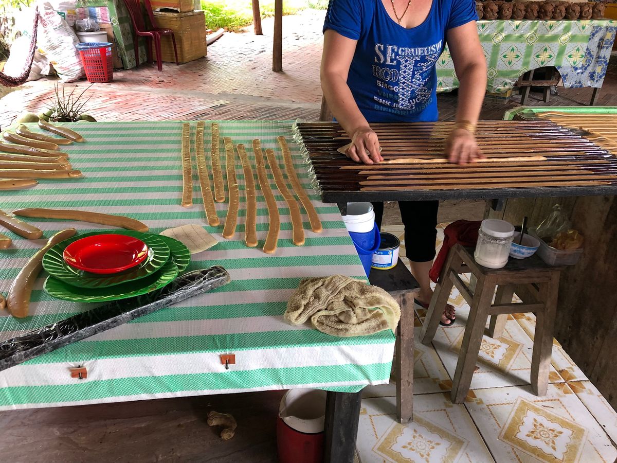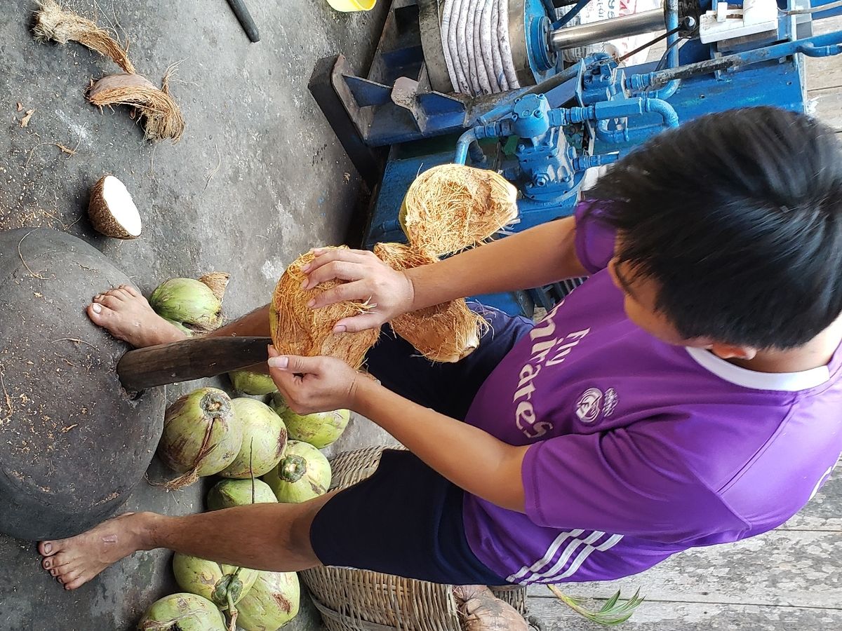 また船に乗ってココナッツ工場へ!ココナッツキャンディの作り方を拝見!作りかけのキャンディに指突っ込んで味見してみて!と(笑)いいの?と言いつつ指突っ込んでみました(笑)日本では無理(笑)大人数でも無理!なのでおもしろ美味しかったです。ヘビさんを肩に載せるのは私には無理でしたが、相方はしてもらってました。人懐っこくてなかなか離れない。彼の頭の上に、まるでクレオパトラの絵のように乗っていきました。股間にも(笑)これも少人数なのでもれなくできたのと、ガイドさんの機敏な行動のおかげです。