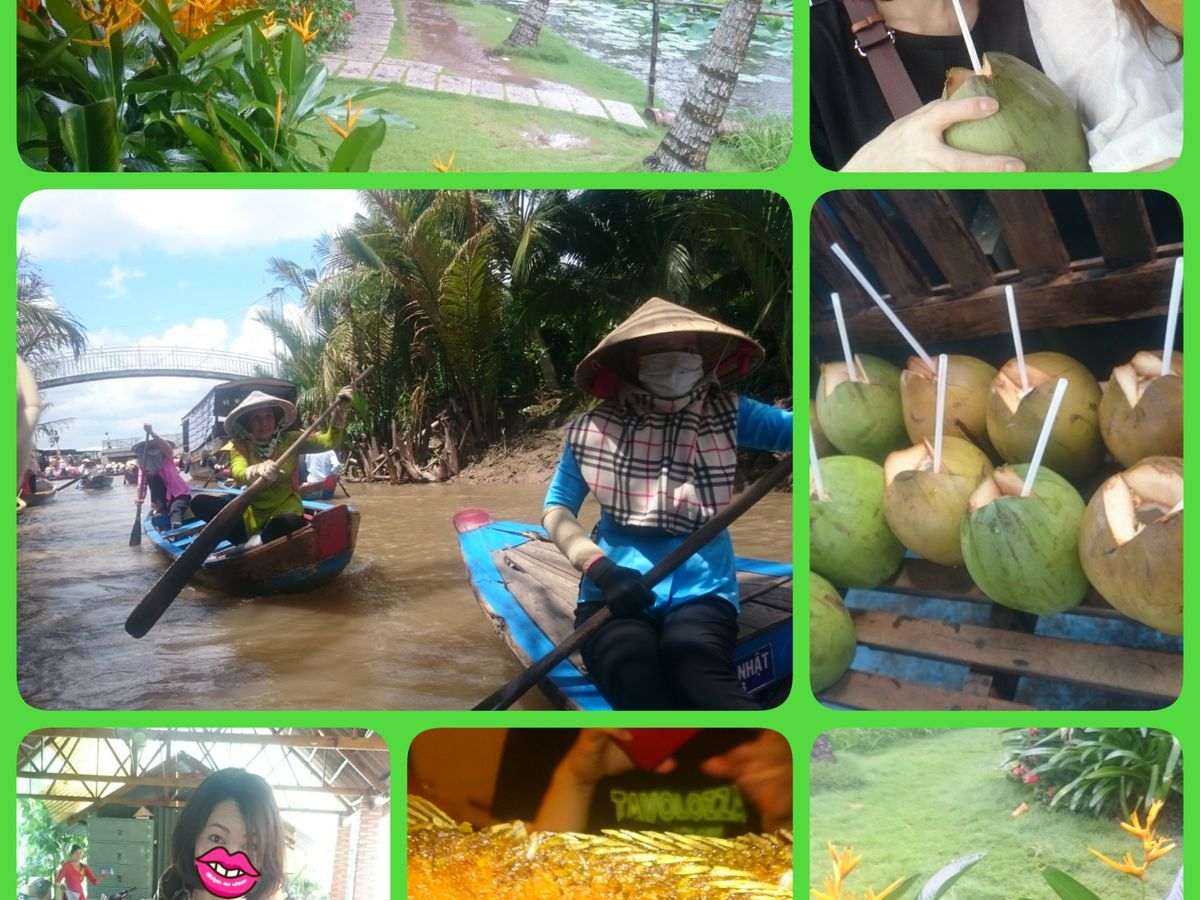 朝7:30ホテル(ロッテレジェンド)のロビーにお迎えが来て、タクシーで10分ほど移動し、TNK オフィスで一緒のツアーの方と合流しました。日本語ガイドツアーの仲間は5人で、英語ガイドツアーと一緒のバスで出発しました。一時間程行ったところで、レストランやお土産屋さんがある場所でしばしトイレ休憩。中庭にはハスの花が咲いていて、景色を楽しむことができます。次の目的地は永長寺で、炎天下のなか過ごすことになり、日傘や帽子をホテルに置いて来てしまったことを非常に後悔しました。そして、こちらで急に雨になり、メコン川でモーターボートに乗るときにも雨は止まず、カッパ着用となりましたが、途中から雨は上がり、ボートの先で写真をとってもらったり、周りの景色を楽しみながら過ごし、島へ上陸。ザボンなどのフルーツがなる道を通り、食堂に到着すると、お待ちかねのランチです。飲み物は別料金ではありましたが、ベトナムの缶ビールを頂き、観光気分を盛り上げます。値段は日本で購入するものと、同じくらいだったような気がします。象耳魚は白身でクセもなく、これを包んで食べる生春巻はとても美味しかったです。私の一番のお気に入りは、揚げ春巻で、味付けも食感も良かったです。他にも焼きそばやスープ、ガイドさんが切り分けてくれたザボンと、お腹いっぱい堪能しました。続いて、ココナッツキャラメル工場では、作る工程も教えていただき、出来立てアツアツのキャラメルを試食させてもらえます。意外にも美味しく、色んな味があるので、お土産用に沢山買って帰りました。次は、ツアーのメインイベント、ジャングルクルーズで、乗っているだけですが、楽しいものでした。そして、最後の場所はハチミツ農園です。ミツバチの巣をみせてもらったり、喉が乾くくらいハチミツたっぷりのお茶を飲んだり、フルーツを食べたり、現地の音楽演奏を聞いたり、その間お土産売りがあったり、盛りだくさんです。 帰りはホーチミン市まで2時間程度、長い道のりでしたが疲れた体にはちょうどいい昼寝時間となりました。