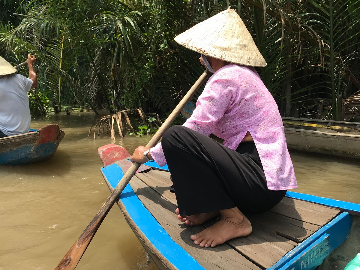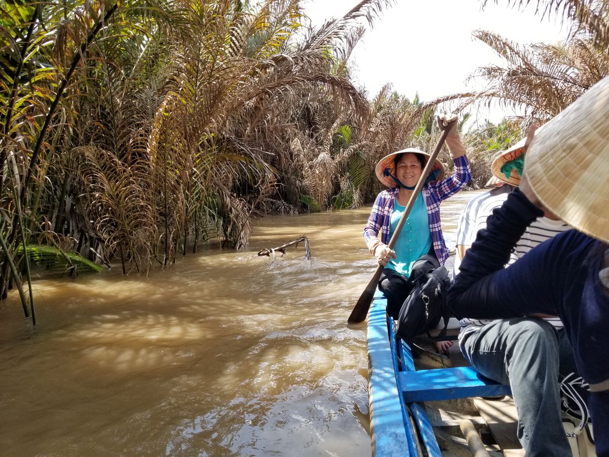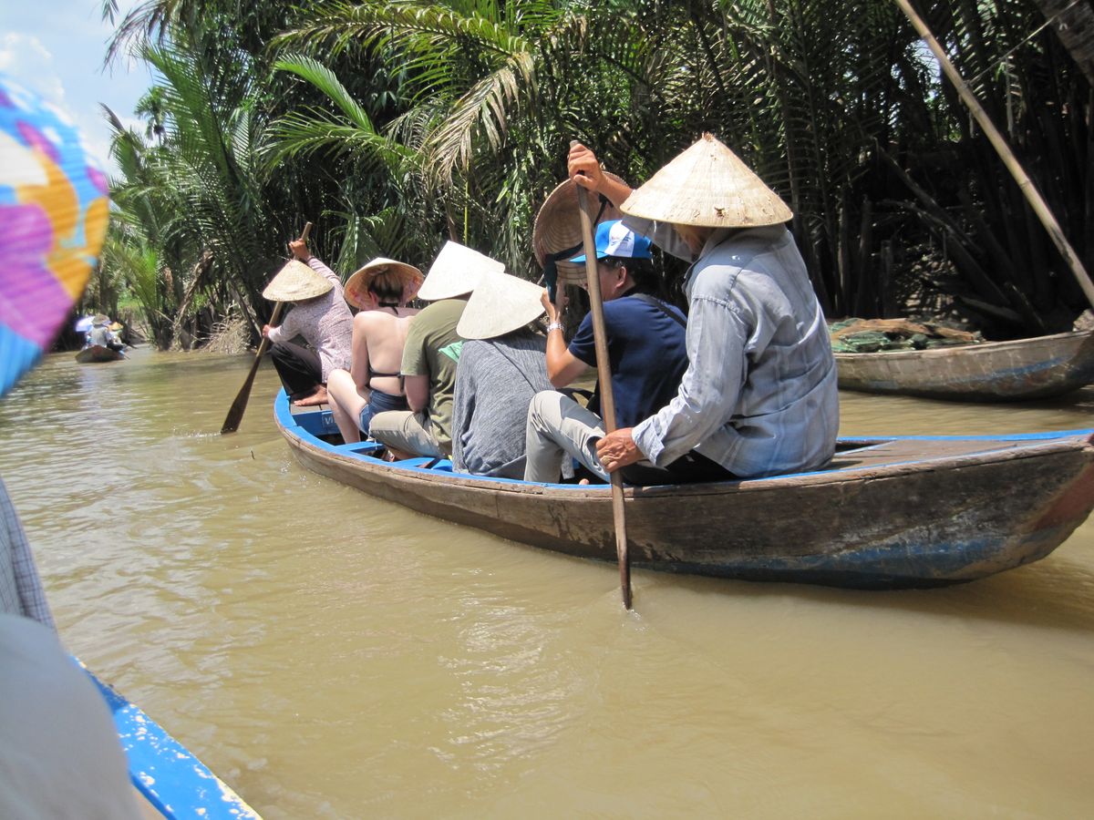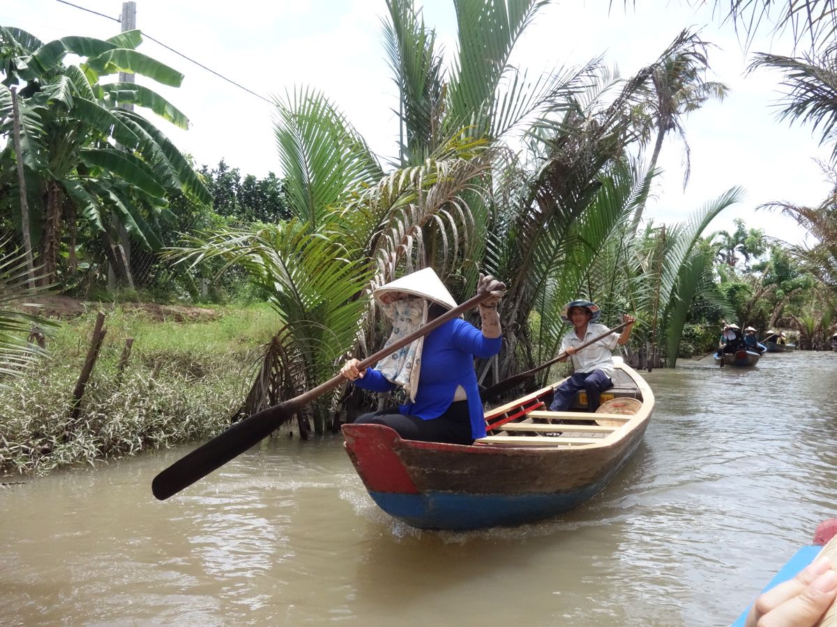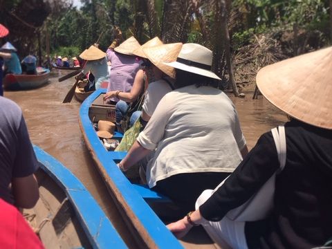 バイクに占領されたホーチミン市街をバスで脱出。1時間半の道のりでしたが、ガイドのアンさんの案内が面白くて笑いが車内に広がっていた。このツアーのクライマックスは、やはり手漕ぎボートでの川下り?川上り?4人乗りの先頭に座った夫は手漕ぎのお手伝い。役に立ったのかどうかは疑問だが、緊張しながらも楽しそうでした。