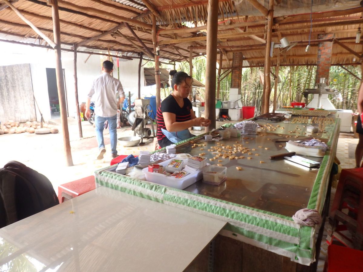 午後のメコン川クルーズは、メコン川をモーターボートで中州にある島に渡り、はちみつ試食(はちみつやローヤルゼリーを営業されます)、現地の民謡を聞きながらのトロピカルフルーツ試食(チップの籠がまわってきます)、メコン川支流の手こぎボートに20分程度乗った後にココナッツキャンディーを作っているところを見学・試食しました。メコン川クルーズそのものよりも、若干営業が多いと感じる午後でしたが、それもお国柄のご愛嬌なのでしょう。