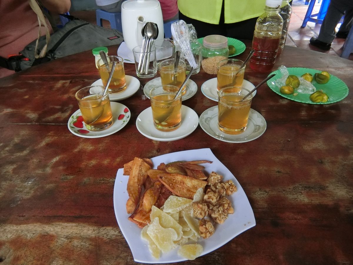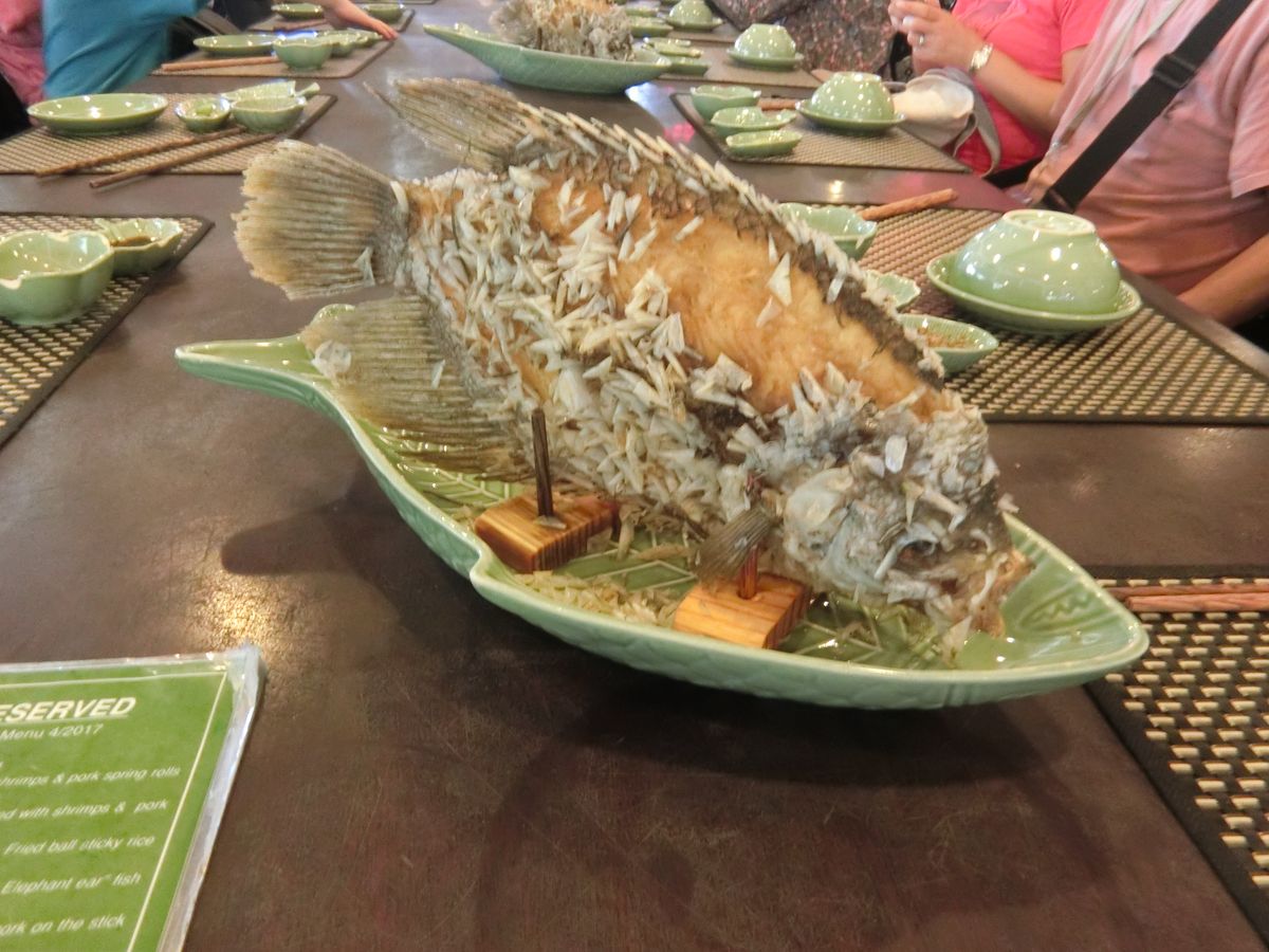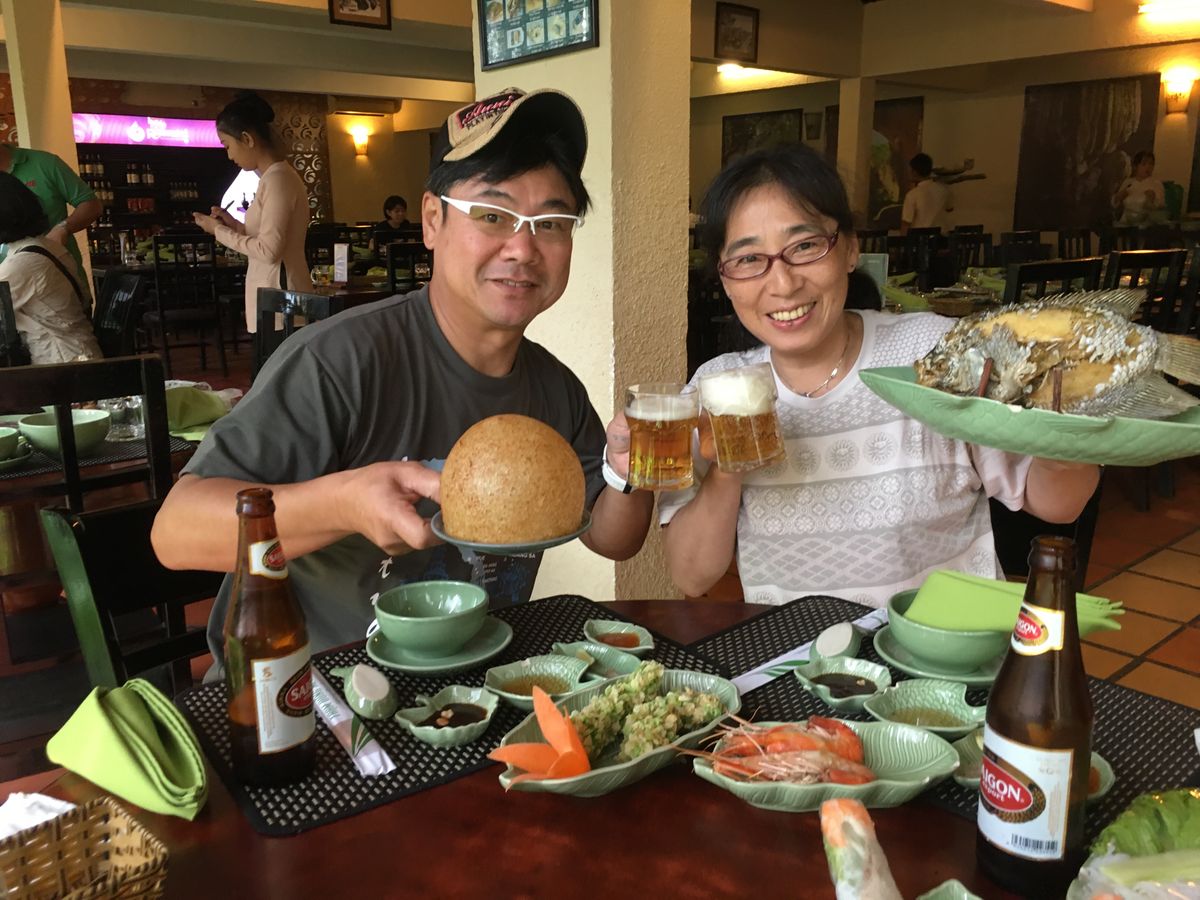 今回は見学で時間が押していたため、途中14時過ぎの昼食です。オシャレなレストランで名物の象耳魚の生春巻き、真ん丸の揚げ餅など地元料理を美味しくいただきました。